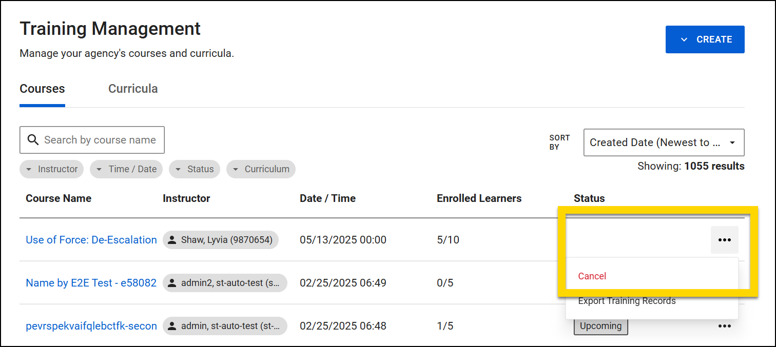 Open the More Actions [...] menu to cancel a course (if it is upcoming) or export learning records (if it is in progress).