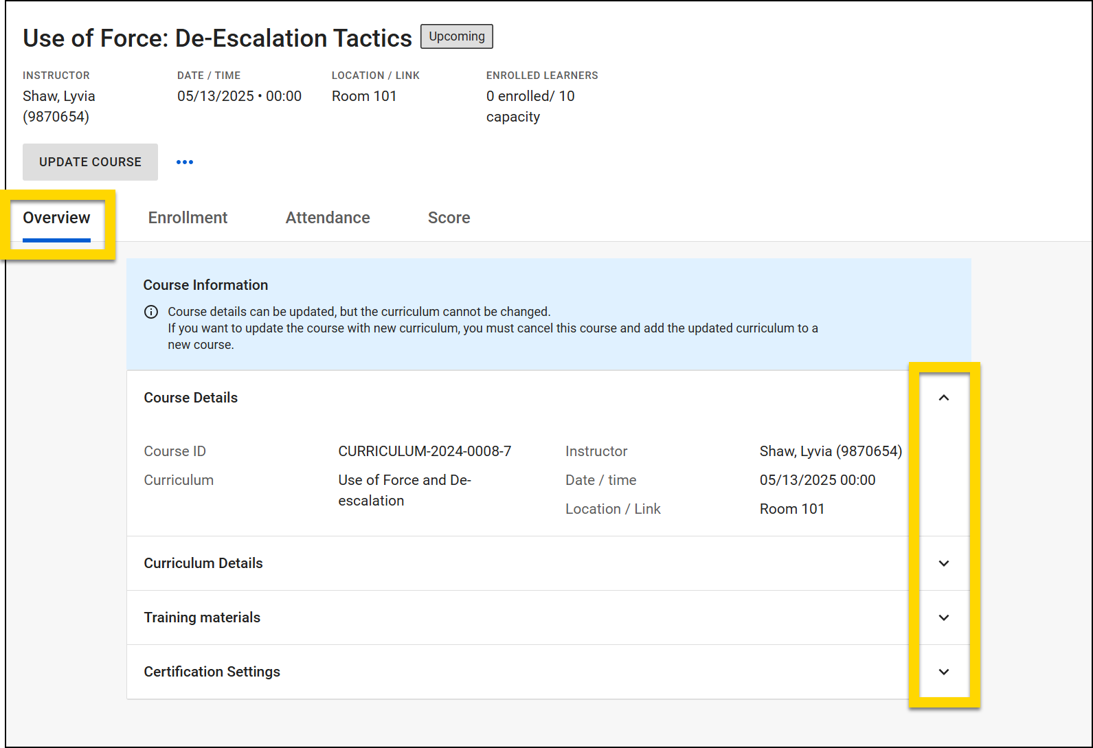 The Overview tab contains all course information, including Course Details, Curriculum Details, Training Material, and Certification Settings. Use the arrows to expand and collapse each section.