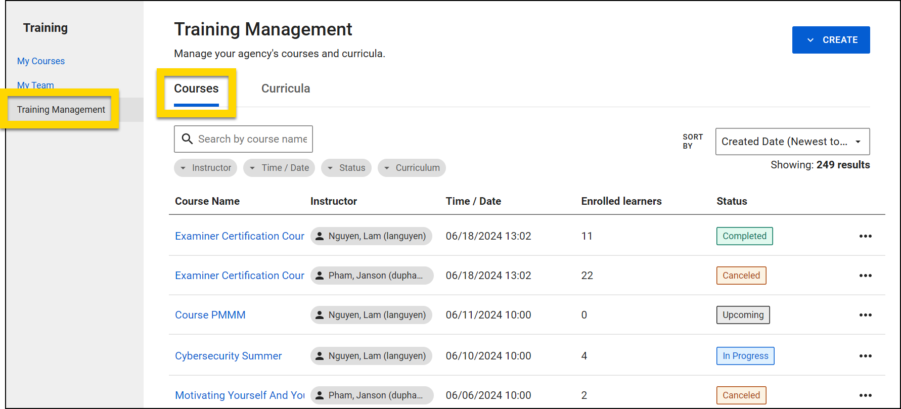 - Once a course is created, you can view it and update as necessary from the Courses tab.