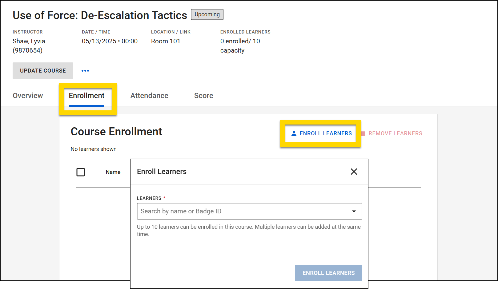 - Enrolled Learners: The number of learners enrolled in the course. If the course has a limited capacity, the total capacity is also shown.