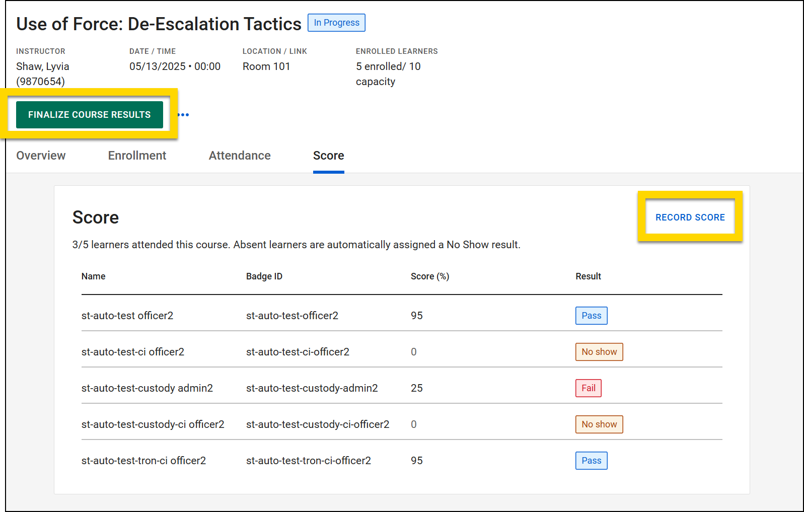 Scores for all learners must be entered before a course's results can be finalized. To record scores, take these steps:
