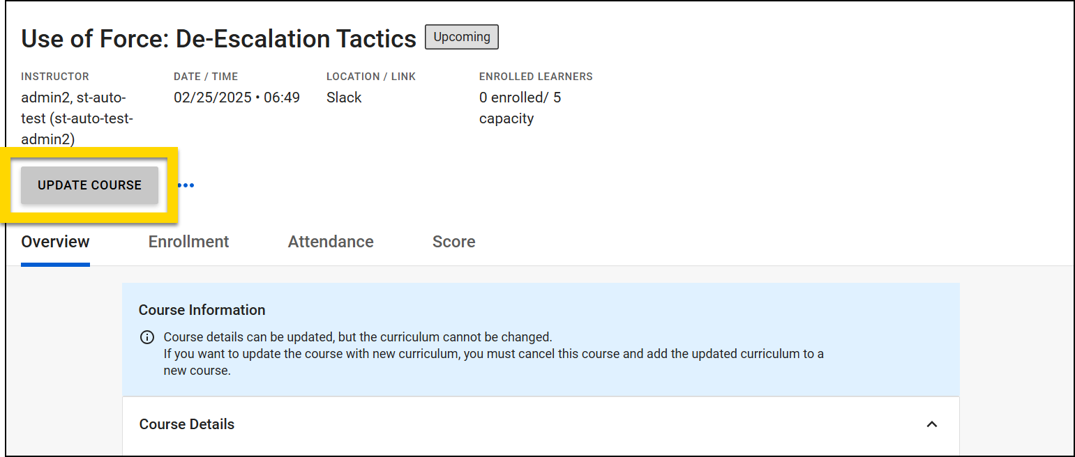 Once you record attendance, you can no longer update the course details (date/time and instructors).