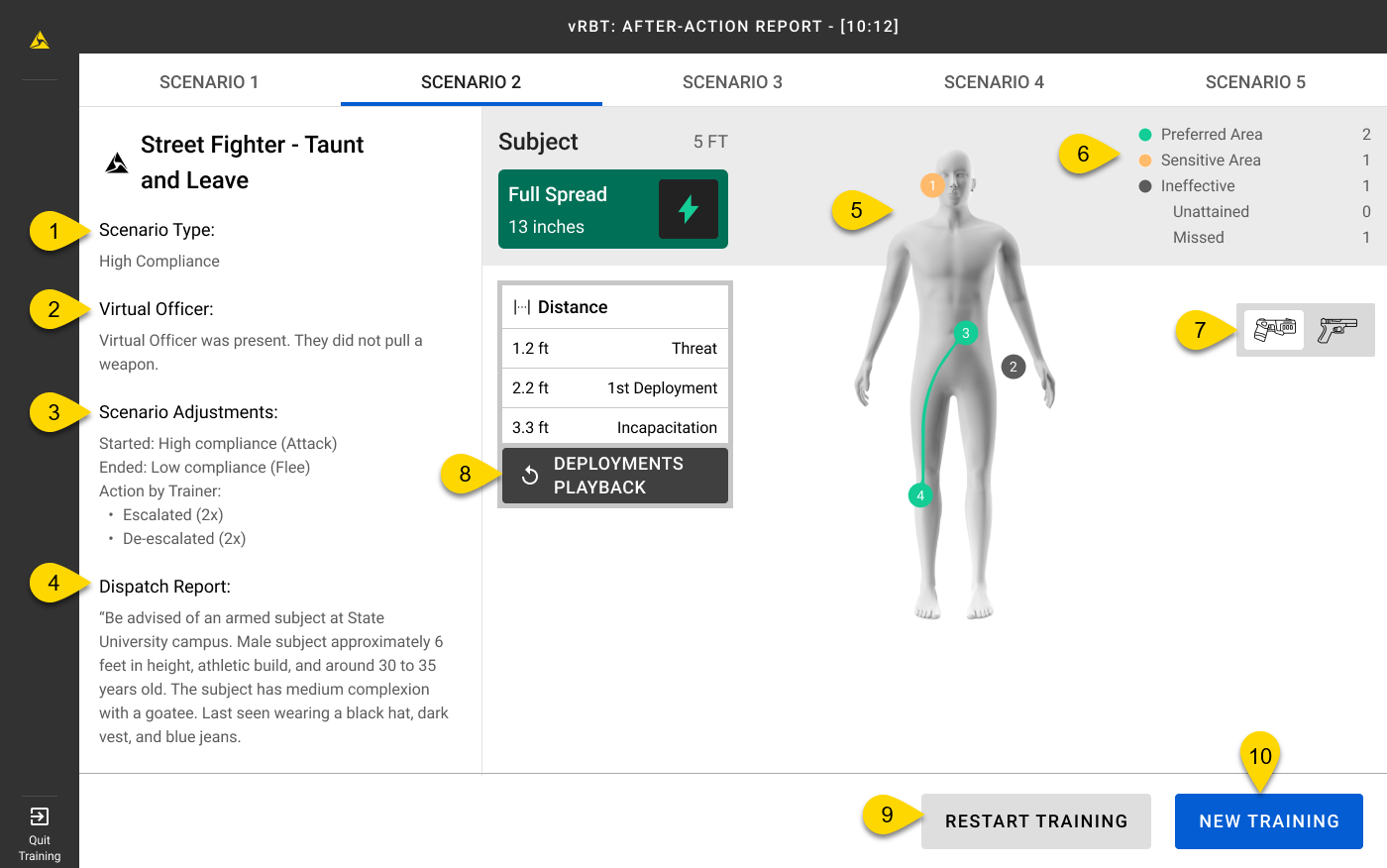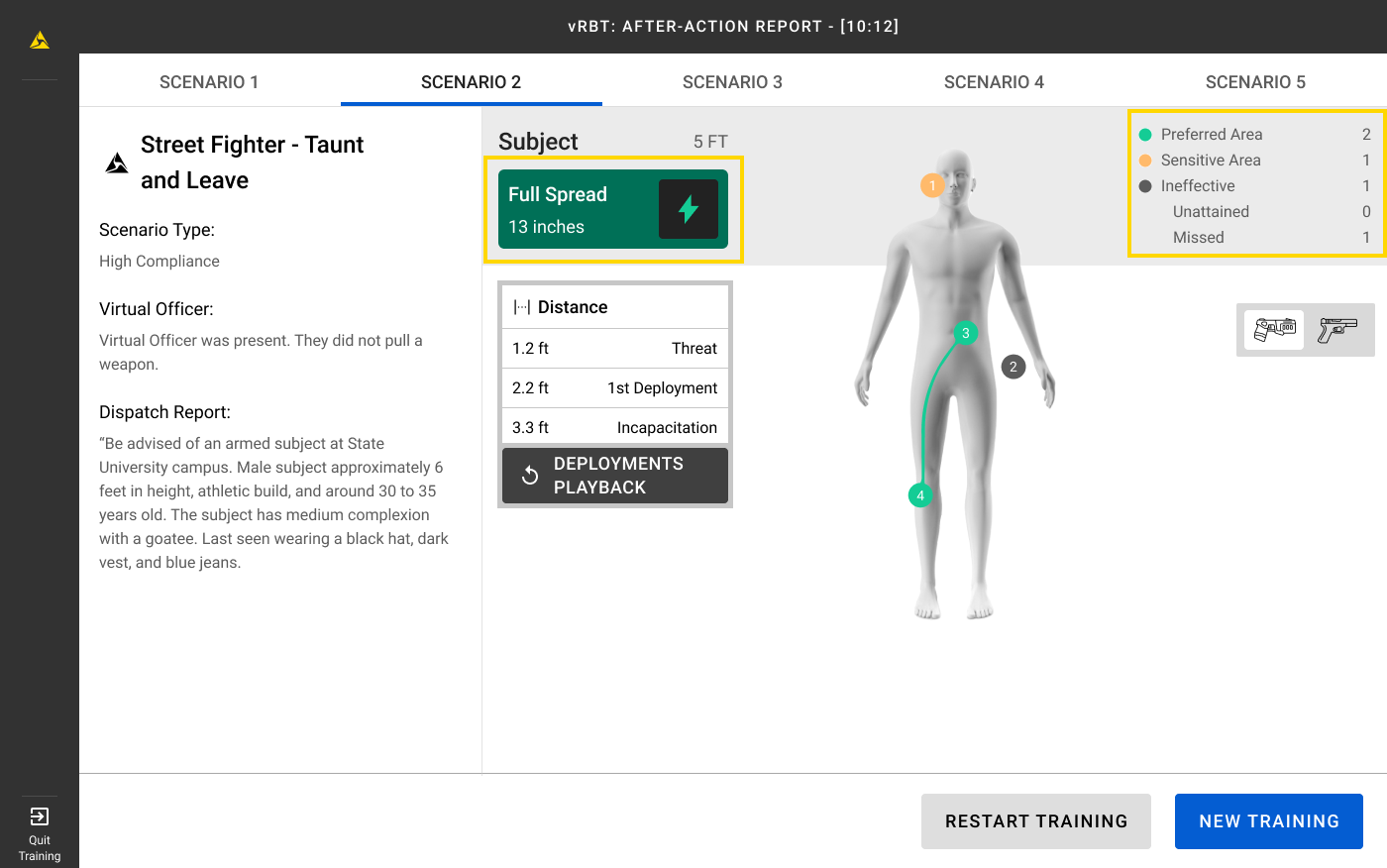 If a TASER VR Controller was used, the After-Action Report will display details such as the spread and type of hit (preferred area, sensitive area, or ineffective area).