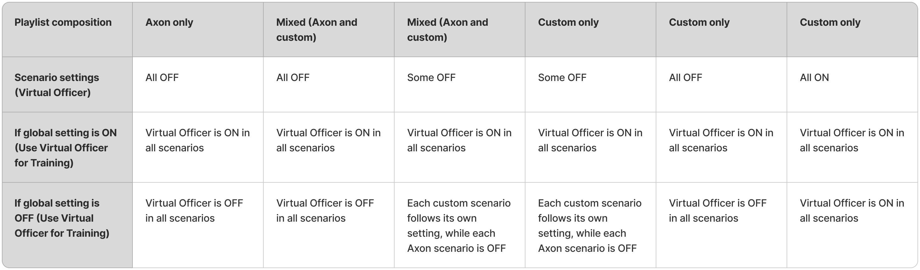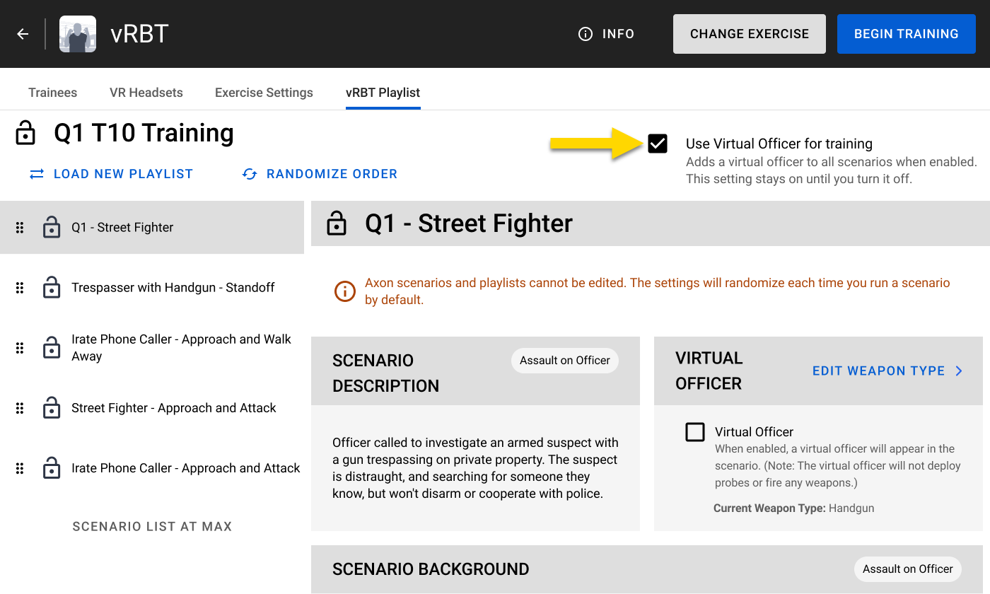 - For Axon scenarios, the setting must be enabled at the playlist level, since individual scenario editing is not available. (See How to enable the Virtual Officer setting.)