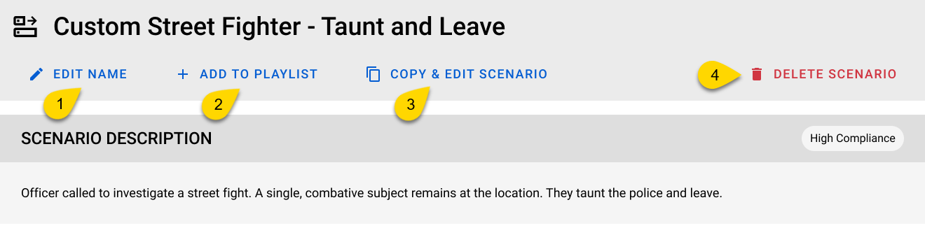 Trainers can view the scenario details when loading a playlist to better understand each scenario's purpose and structure. This includes reviewing the title, description, and scenario outcomes. For more information, see .