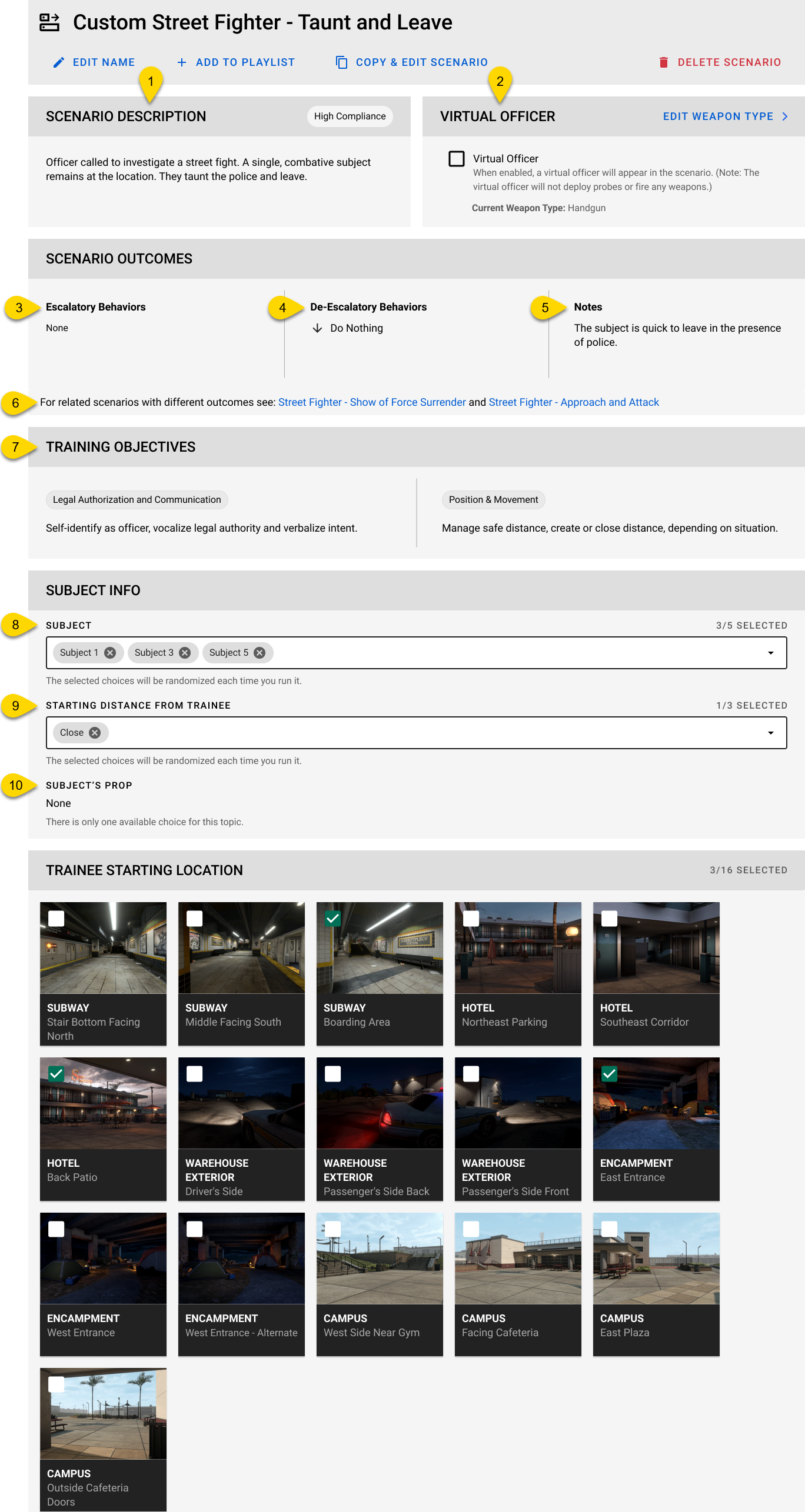 Each scenario includes multiple variations, which change key details such as subject behavior, compliance levels, and the likelihood of force being required. These variations help trainees adapt their decision-making and response strategies based on different situational factors.