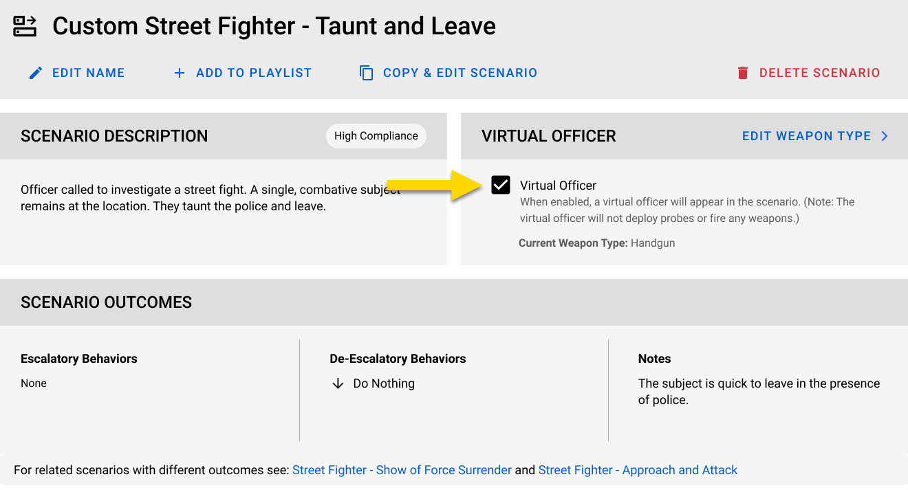 There are three playlists that include "with Virtual Officer" in the title. These versions use the same scenario content as the original playlists but have Virtual Officer enabled by default. This lets trainees to quickly run scenarios with a Virtual Officer without building a custom playlist.