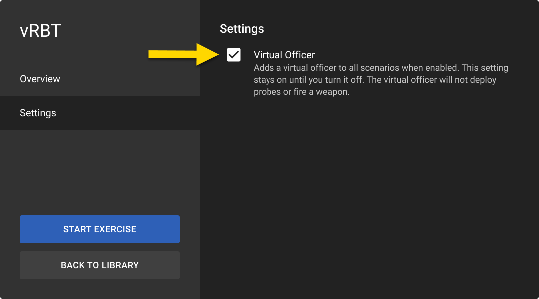 In Facilitated mode, the Virtual Officer setting is controlled by the trainer on the tablet and cannot be changed in-headset.