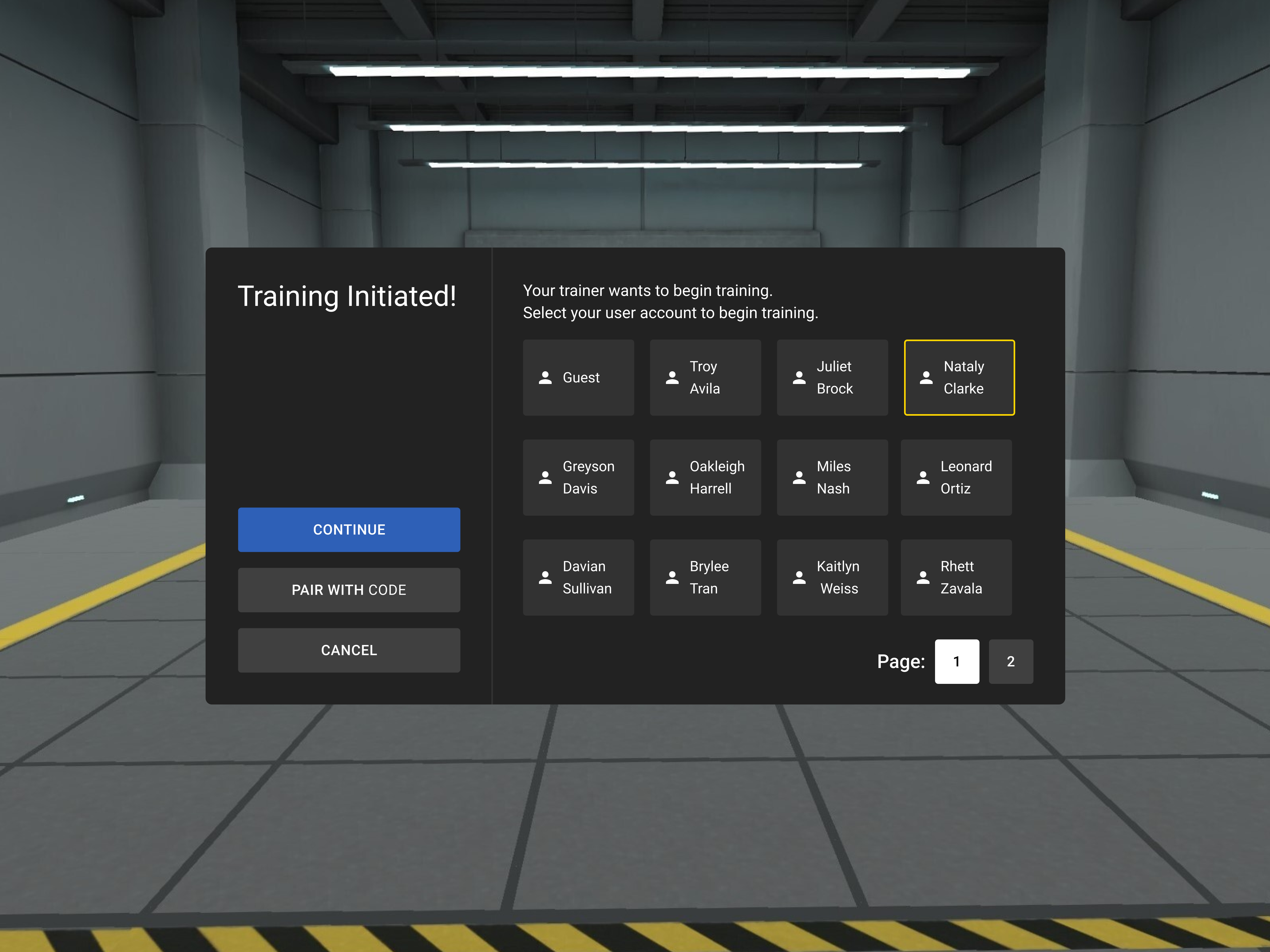 - Select Begin Training. The first scenario in the playlist begins. The Begin Training button will be enabled after the trainee selects their name in-headset. If they are a guest, they should select the Guest option instead.
