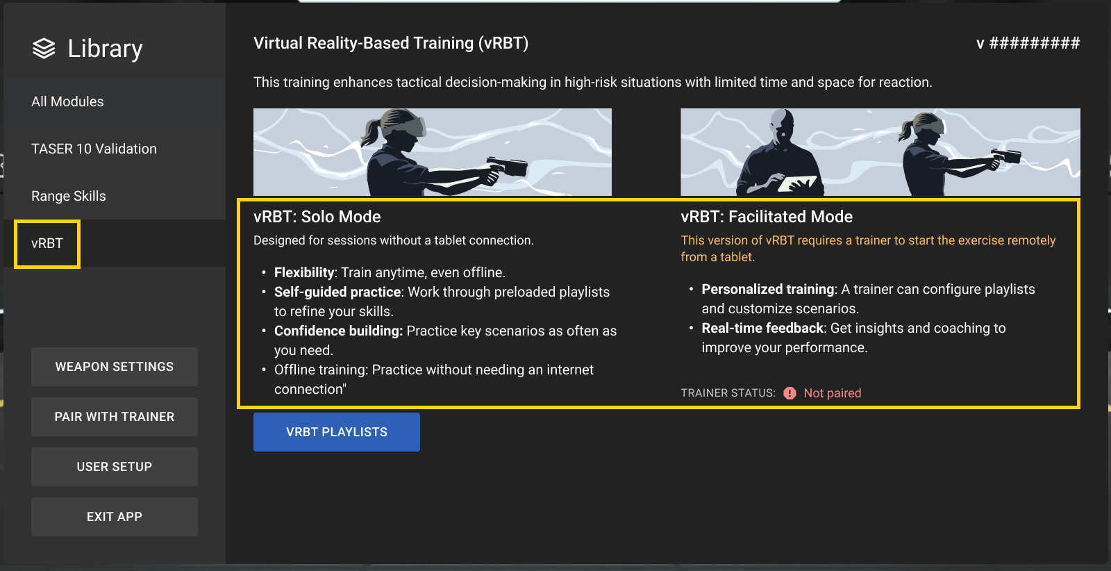 Trainees cannot start a Simulator Training: vRBT playlist from the headset during facilitated training; only trainers can initiate a Simulator Training: vRBT training session for users in-headset from the trainer's tablet.