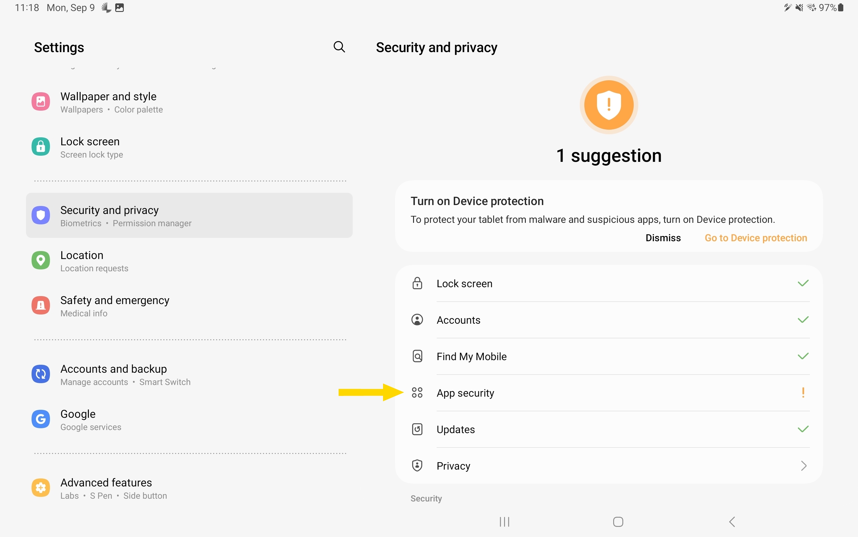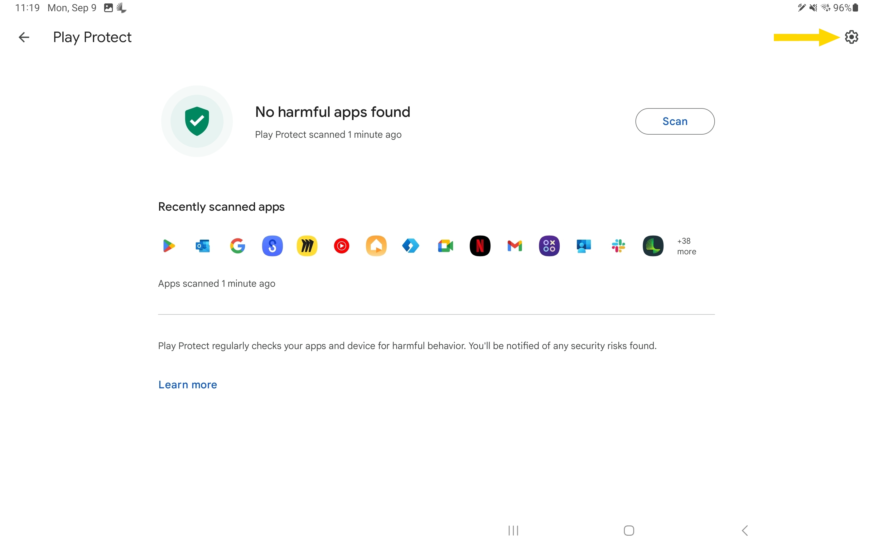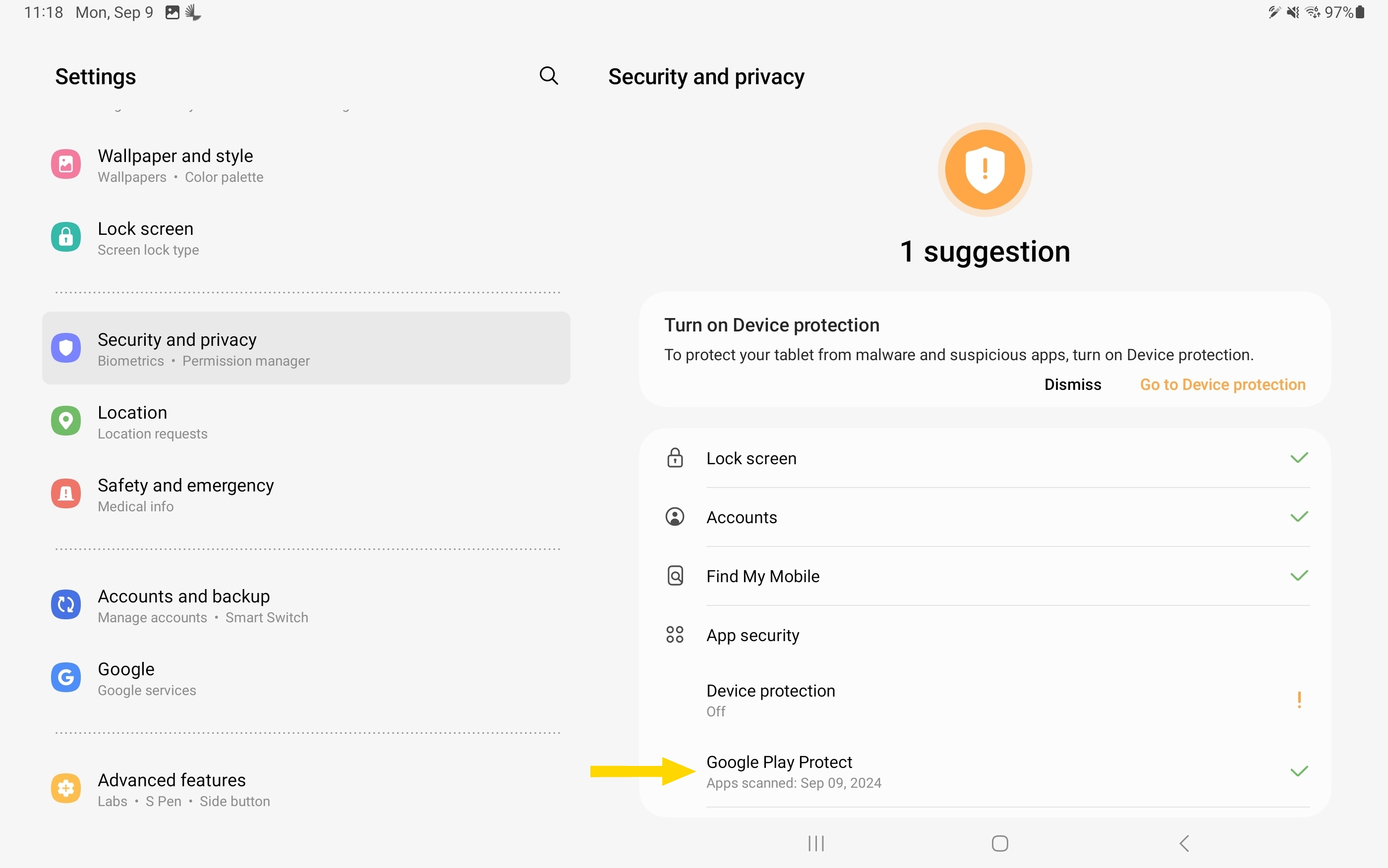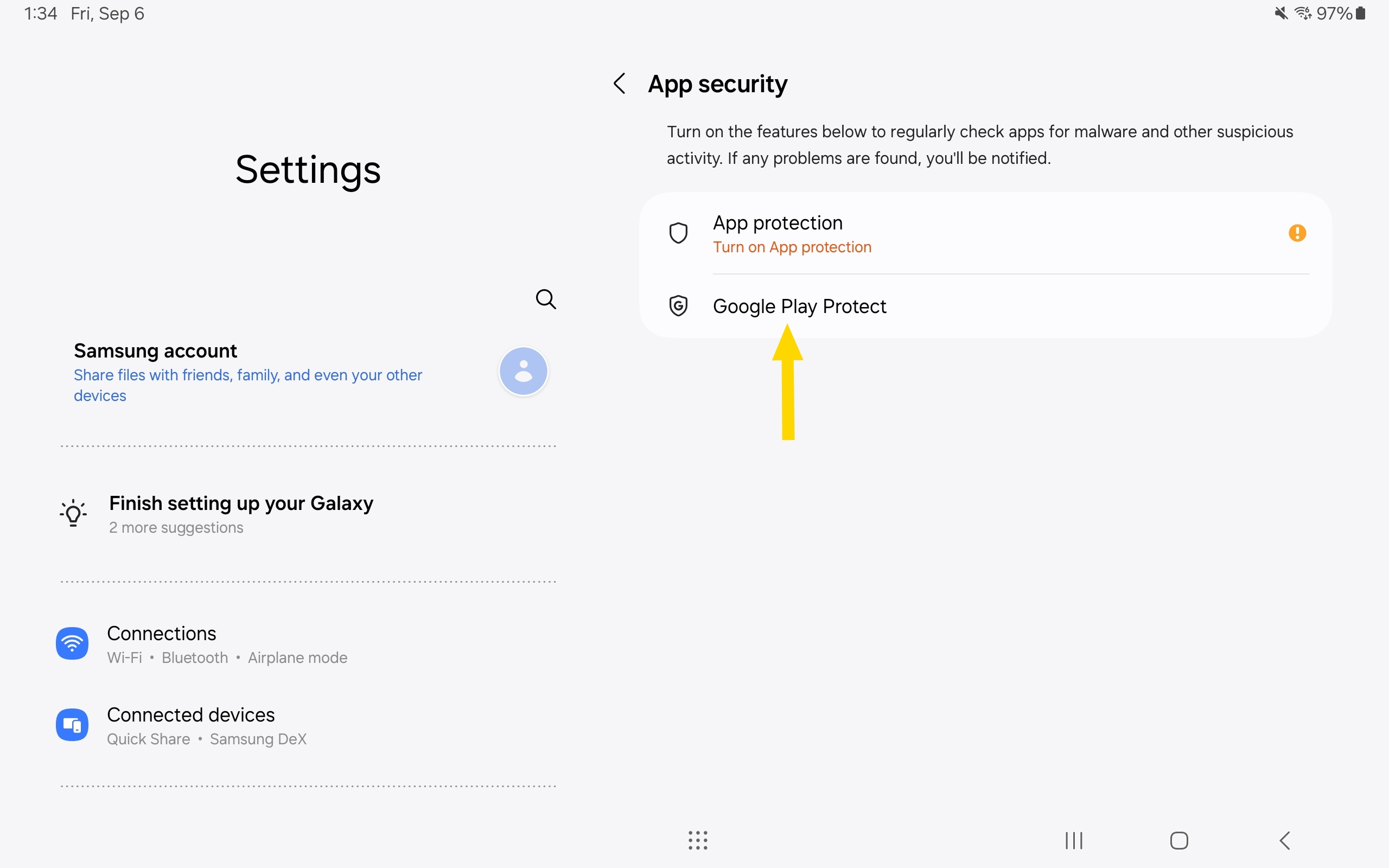 To turn off Google Play Protect from the Samsung Galaxy S9 VR tablet settings:
