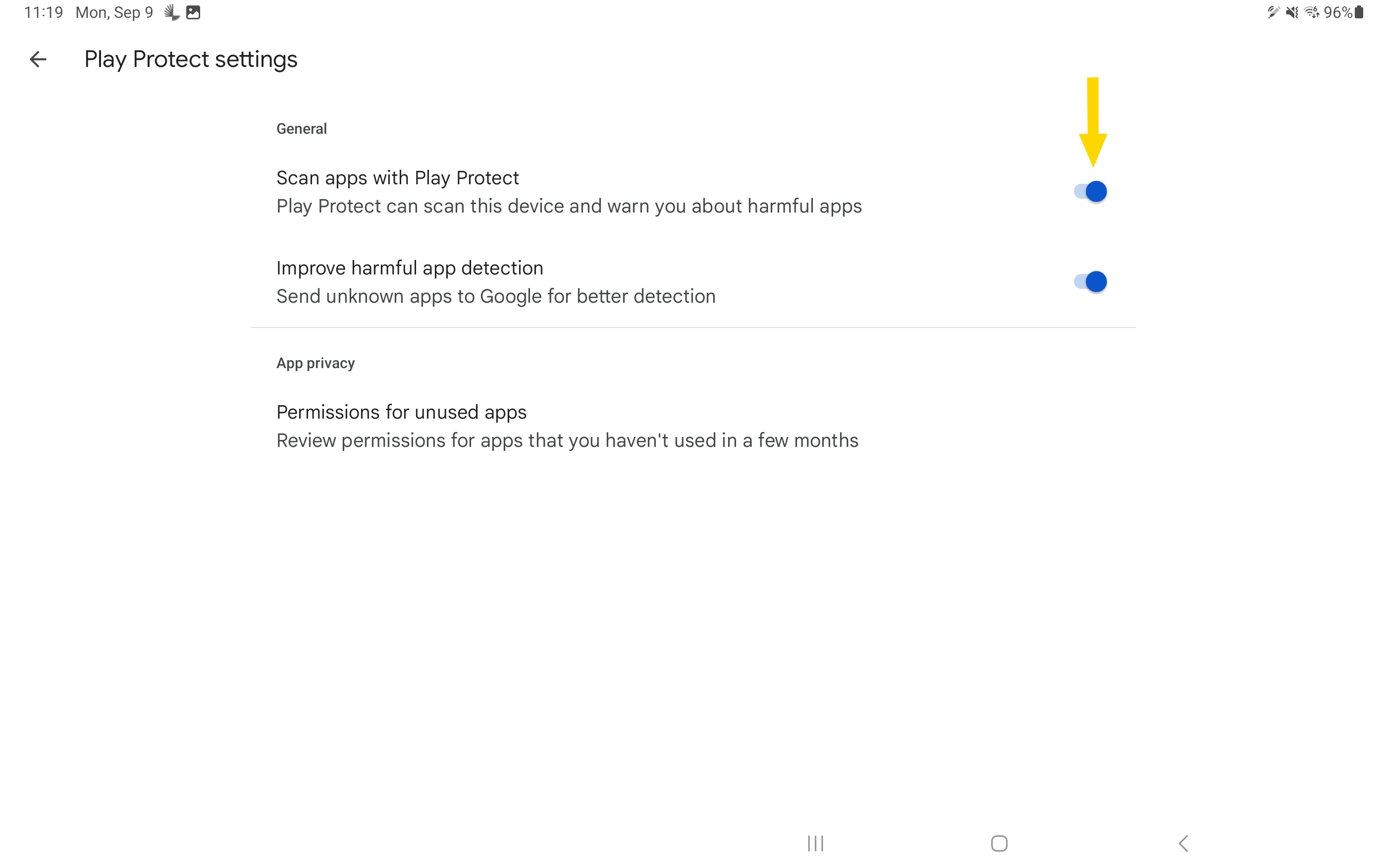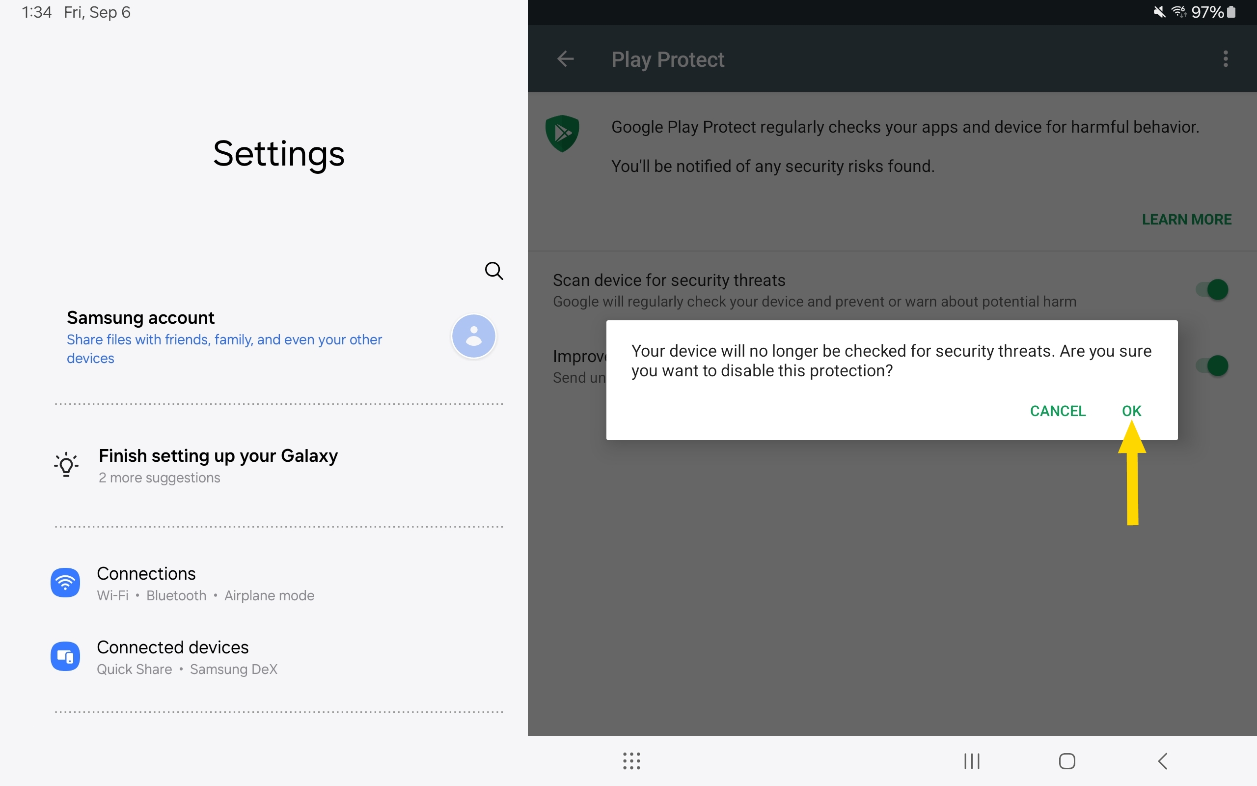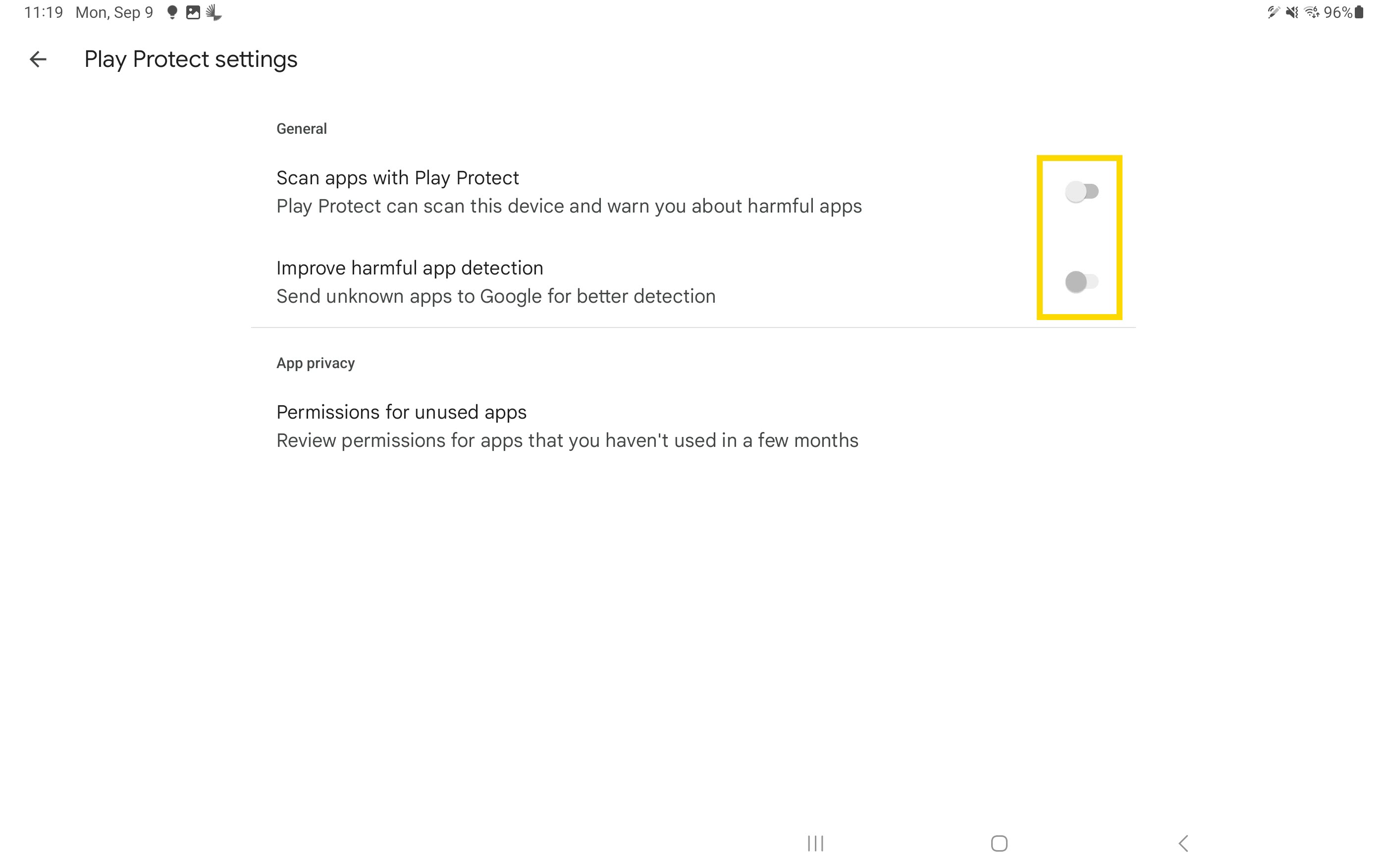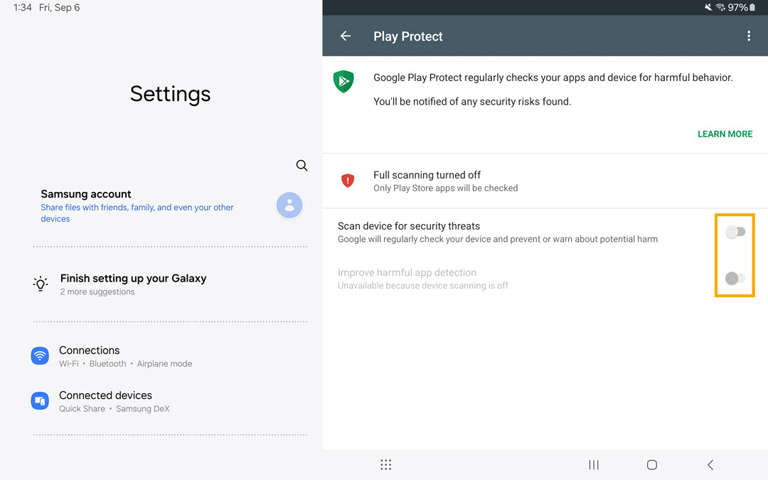 - This will automatically toggle off Improve harmful app detection and turn off Google Play Protect.