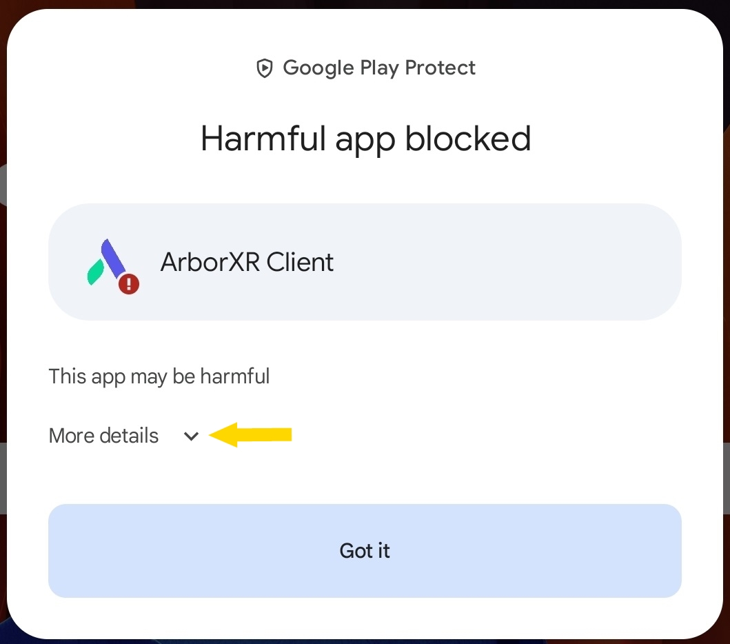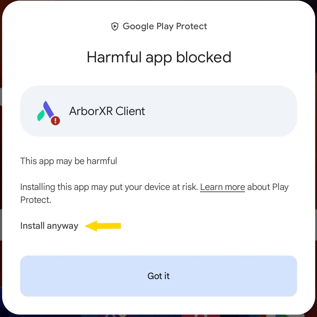 It's important to note that even if Google Play Protect is showing a warning, your device is still protected. ArborXR manages and controls all apps related to Axon VR, ensuring that they adhere to strict security policies.