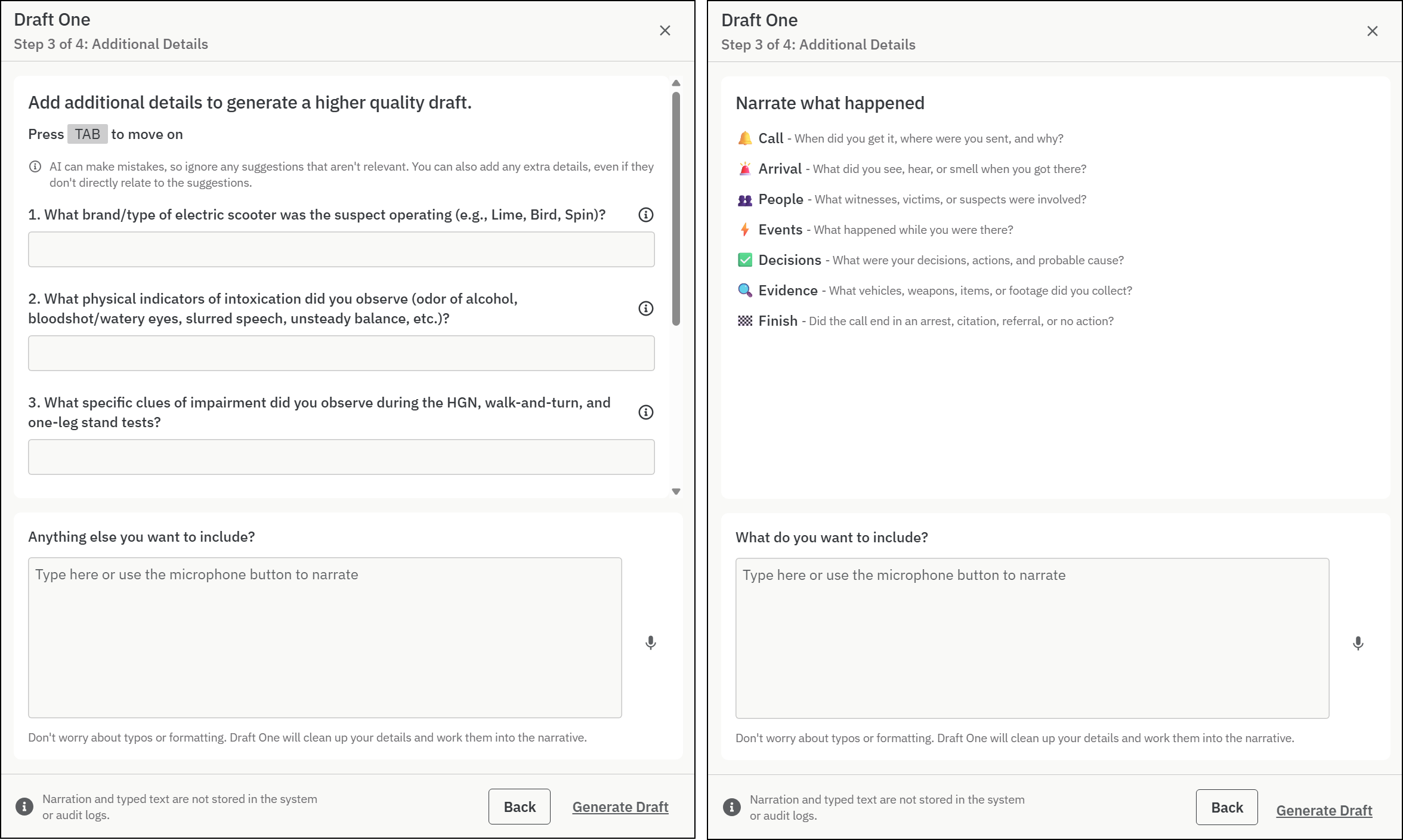 - Draft notes: The larger text box at the bottom of the screen is a combined voice and text space. Use this space to capture any additional context or details. You can switch between narrating and typing when adding information to this field. Don't worry about typos, grammar, or formatting. Just get the facts down, and Draft One will weave them into your final narrative.
