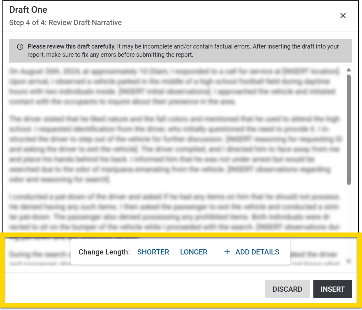 Transcripts can contain errors (misspellings, misheard words, etc.) and may not contain all information about the incident, so adding details and clarification helps ensure higher quality drafts. If you provide these details before the draft is generated, you'll save time later because the draft won't require as many revisions.