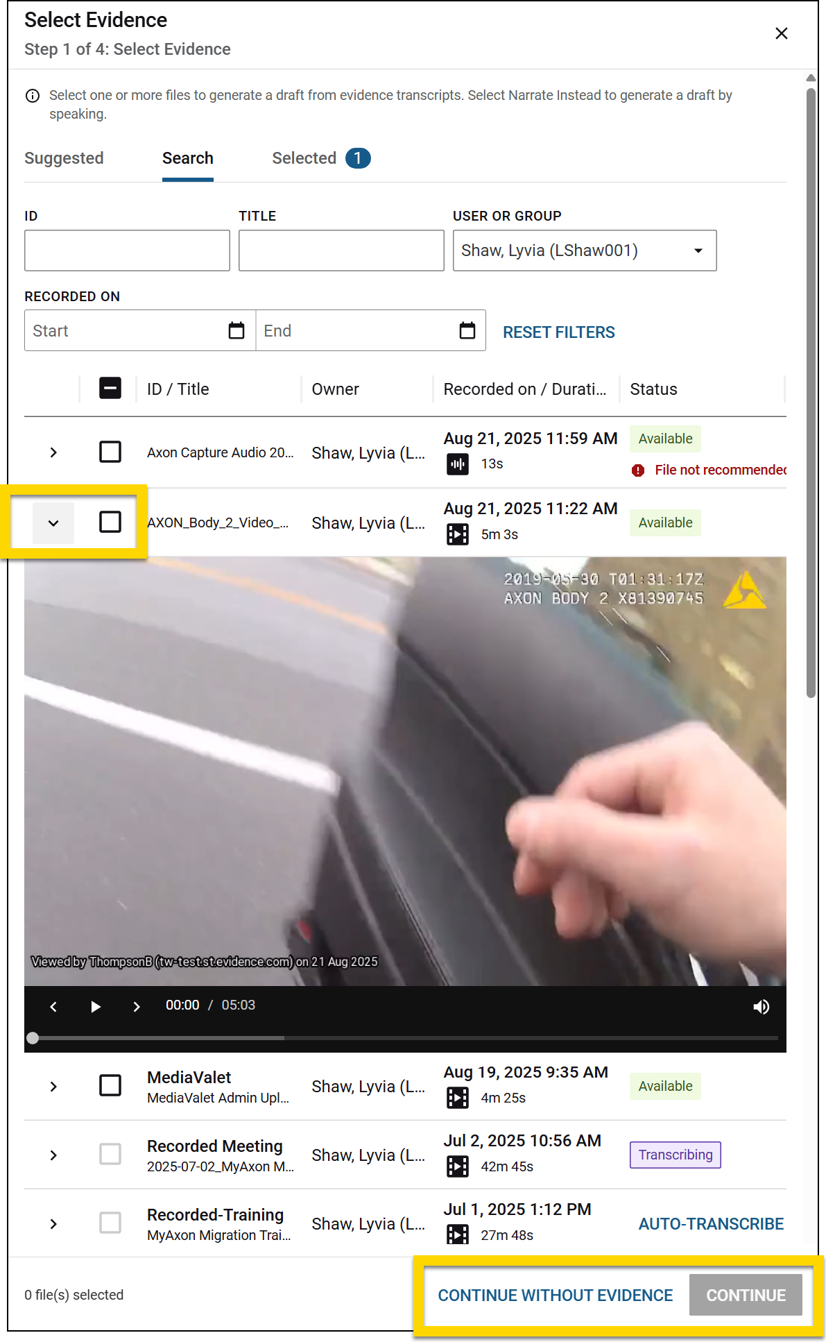 Select Continue after choosing one or more pieces of evidence or Continue without evidence if you do not want to use evidence files and instead want to only provide narration or type out the details of the incident.
