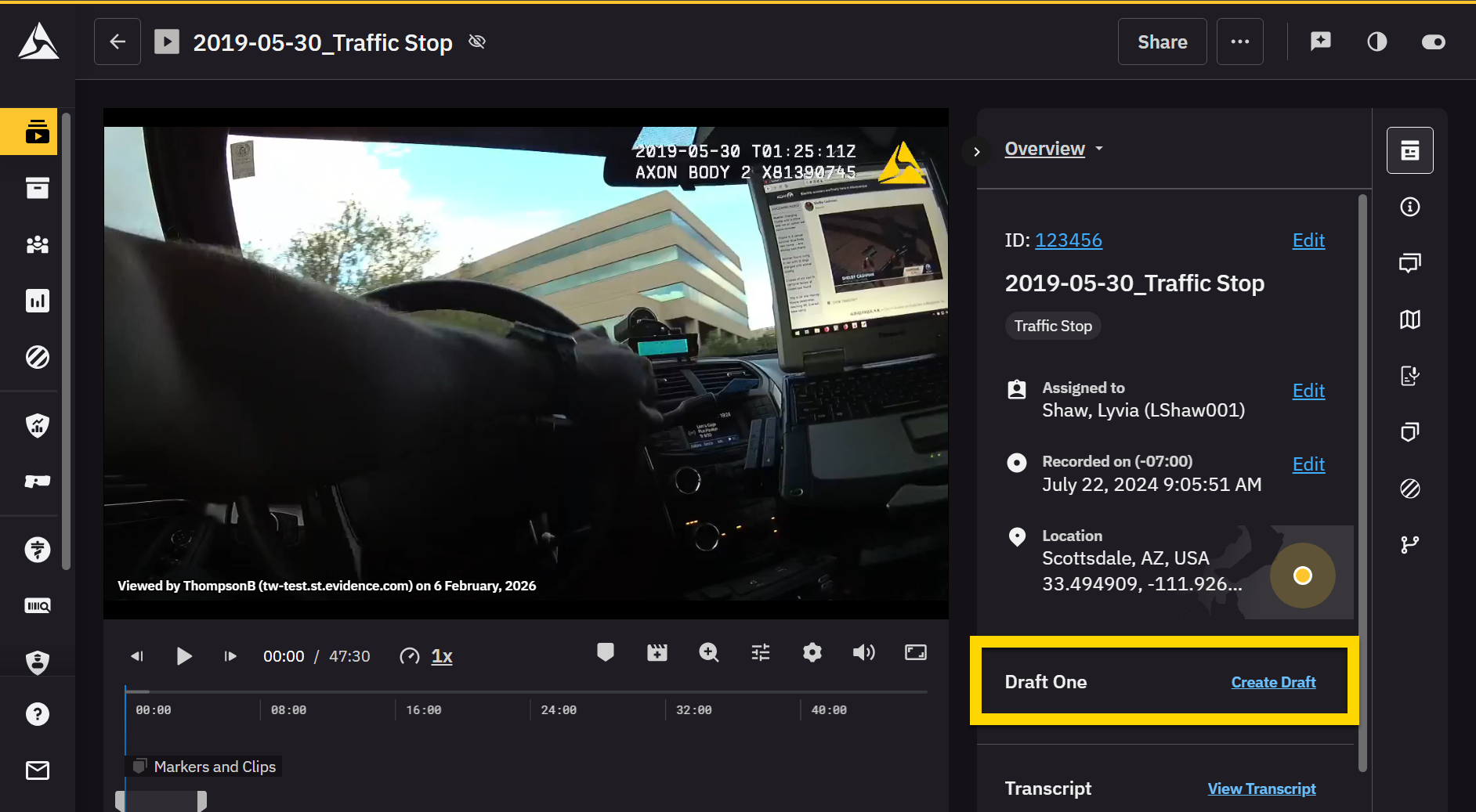 Once your body camera footage is uploaded and the Auto-Transcript is available, you can use Draft One to generate a draft narrative. (Draft One can be used on any playable audio/video files supported by Axon Evidence, not just Axon body camera footage.) You can also use Draft One to generate a draft a narrative without using evidence and instead recording a narration describing an incident. After carefully reviewing and revising the draft, you can copy it to your computer's clipboard (Axon Evidence) or submit it for supervisor review (Axon Records and Standards).