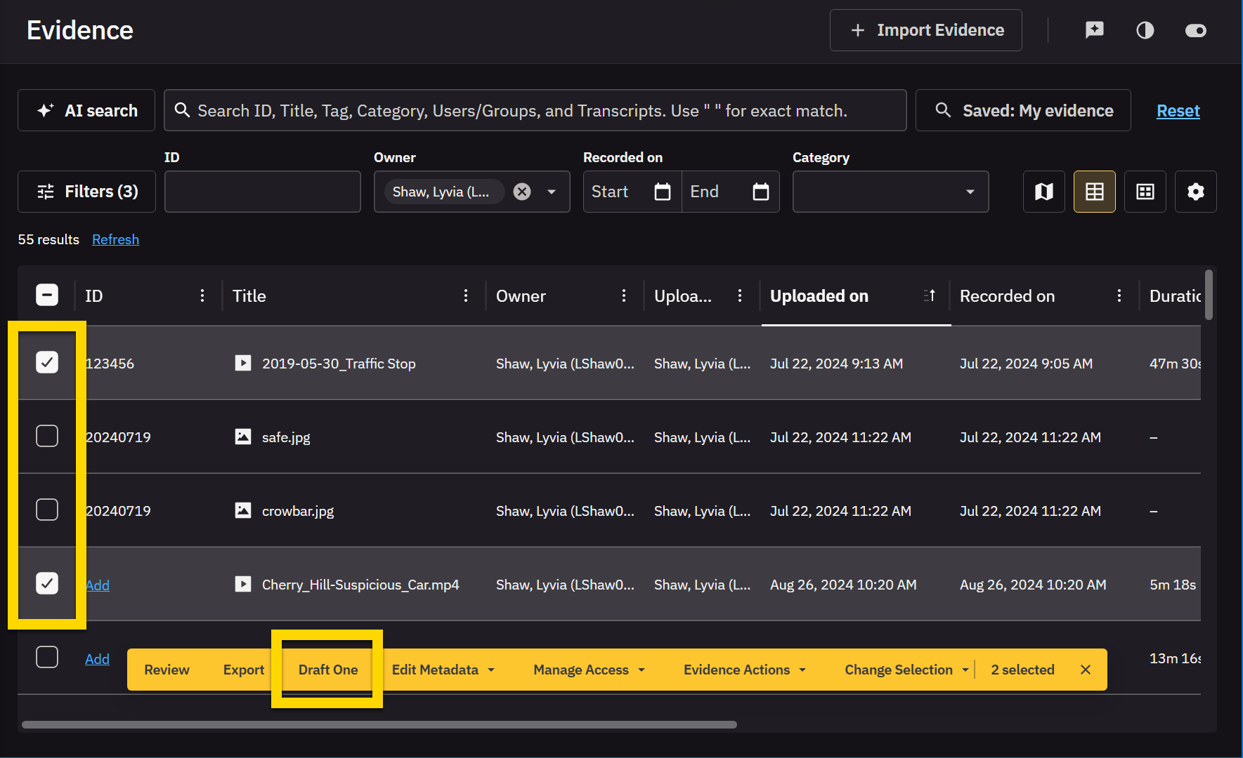 - Search: From Evidence search or within a case, find one or more evidence items you want to use as the basis of a Draft One narrative and select the checkboxes. Select Draft One.