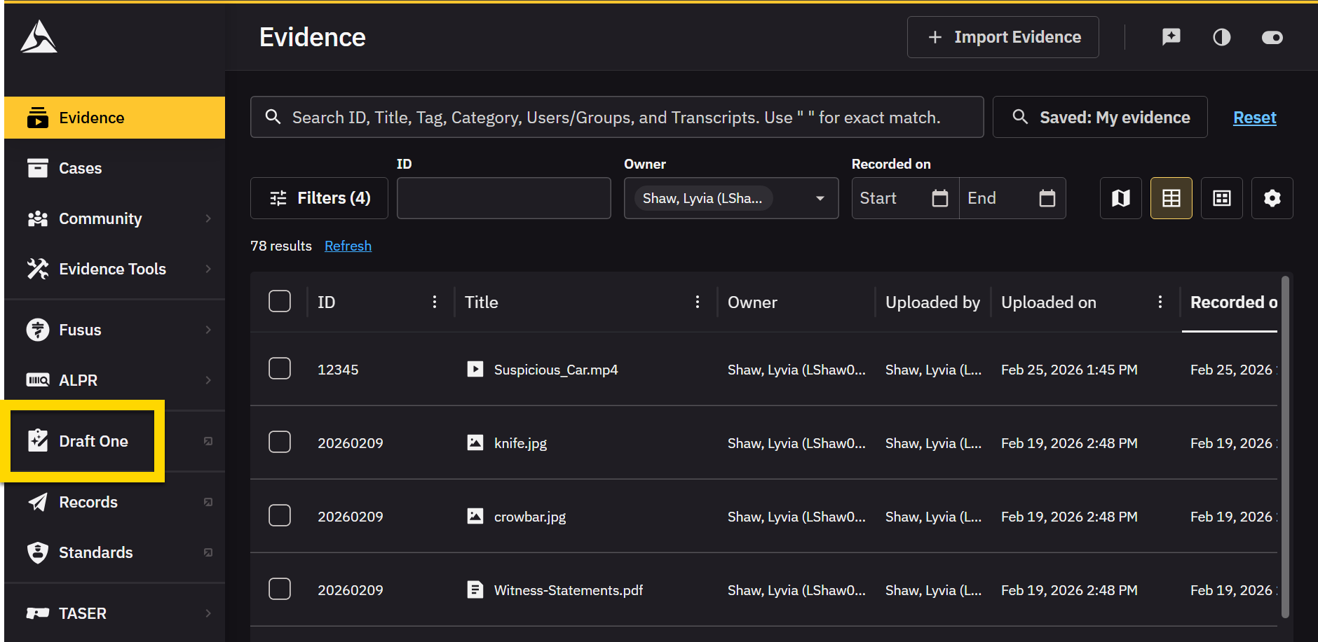 - Suggested: Contains all evidence you have recorded and uploaded in the past 24 hours.
