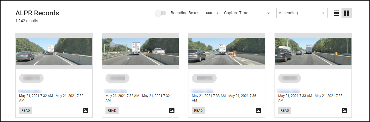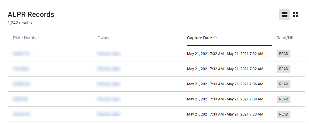 This view presents a simple list of every record matching your search, including plate number, evidence owner, date the record was captured, and hit/read indicator.