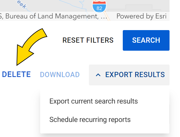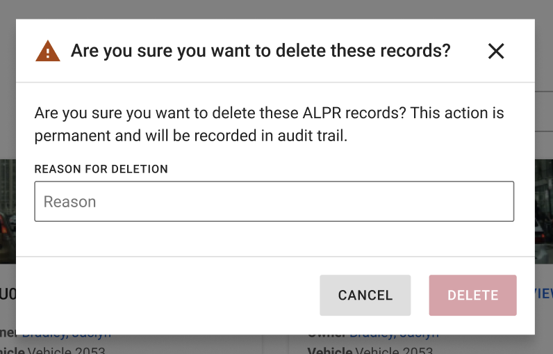 Also on the Record Search tab, above the search results, is an option to delete ALPR records. Hover over a search(s) result to delete and select the checkbox , select Delete, provide a reason, and select Delete to confirm.
