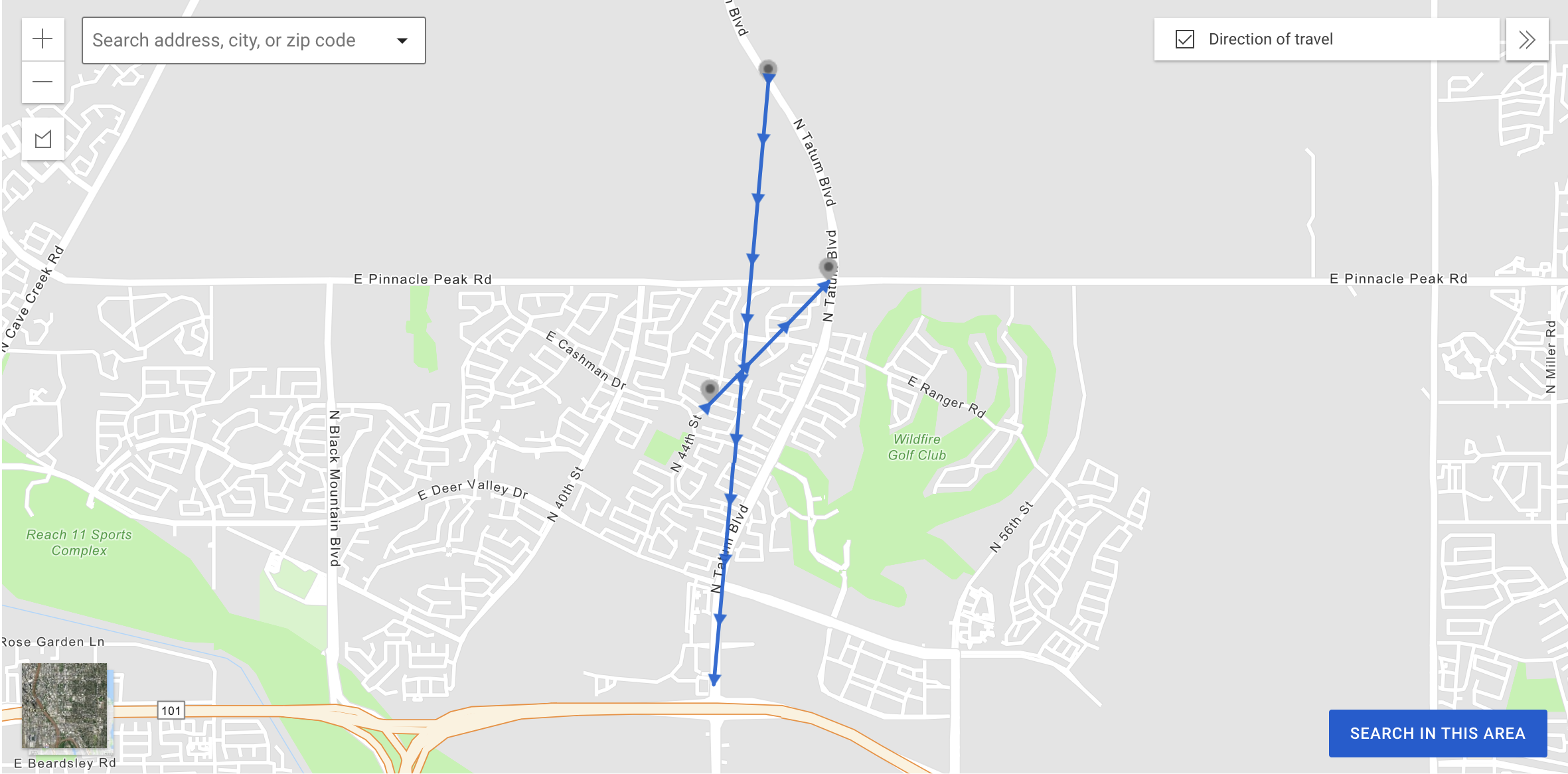 A Direction of travel selector at the top right of the map enables indicators between ALPR read records and GPS markers. If a search identifies (a) one or more plates with either multiple plate reads or (b) multiple GPS markers associated with a plate read, this selector is enabled automatically to show directional lines between read records or GPS Markers captured by one or more vehicles within a 60-minute window of each other.