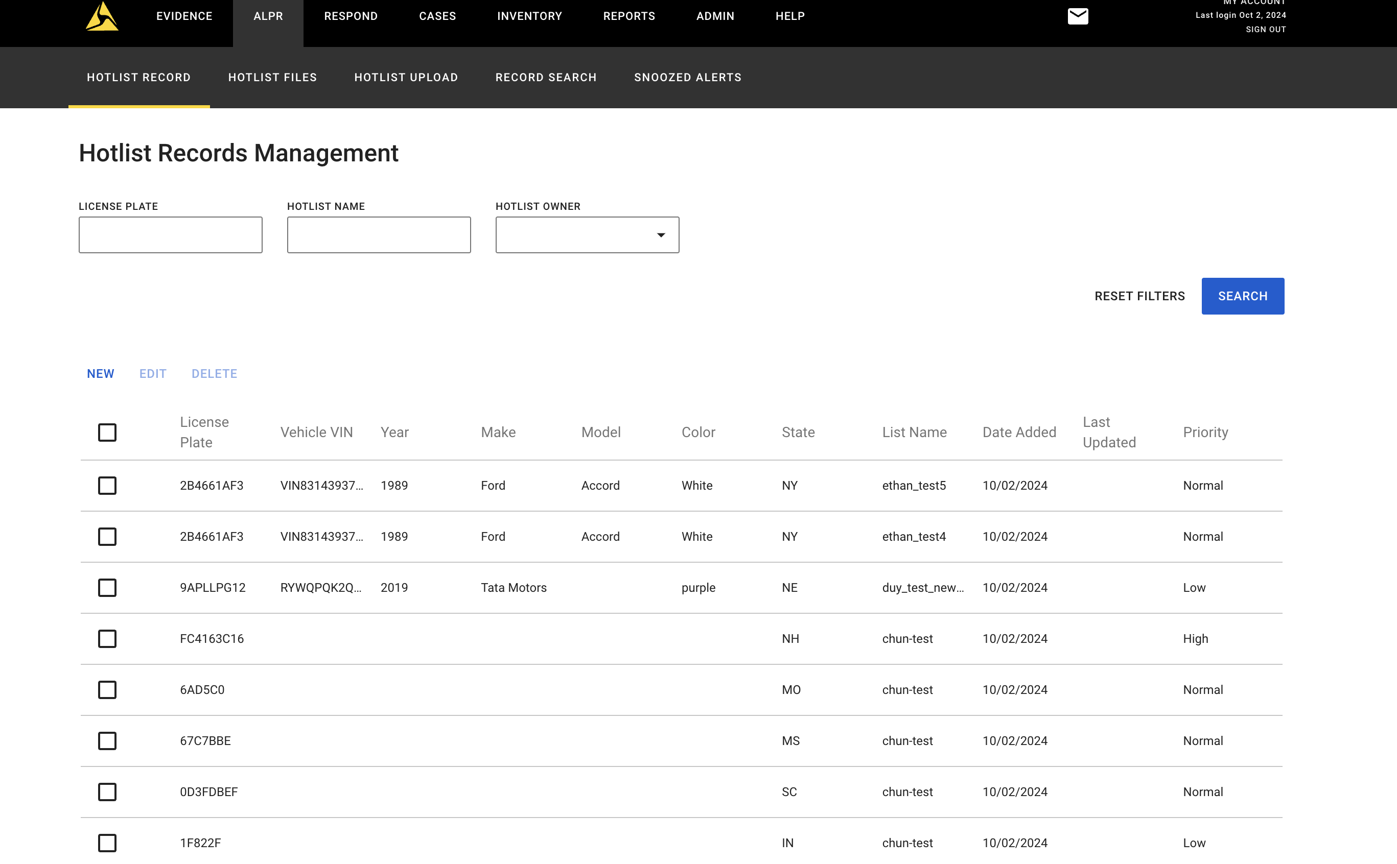 - With hotlist management permissions, your view defaults to the ALPR Hotlist Records Management screen: