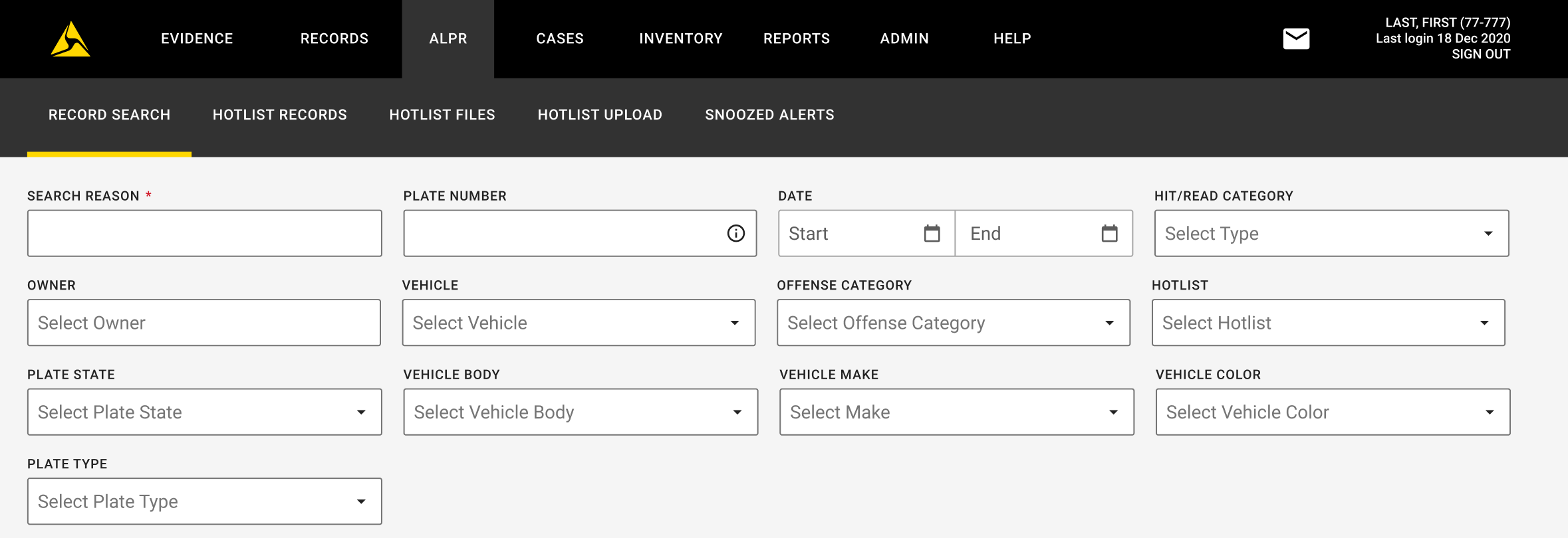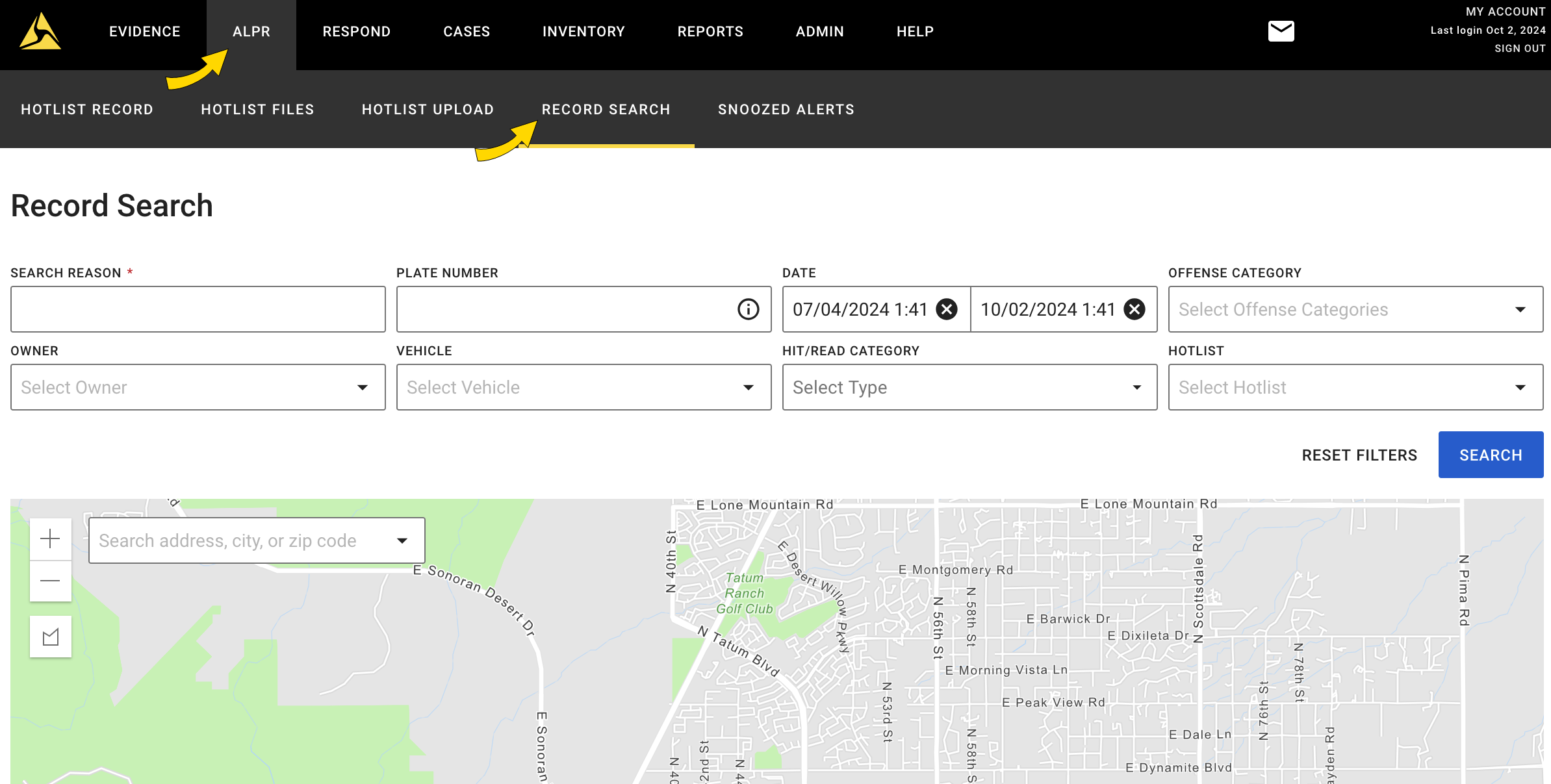 - On the Axon Evidence menu bar, select ALPR, then Record Search.