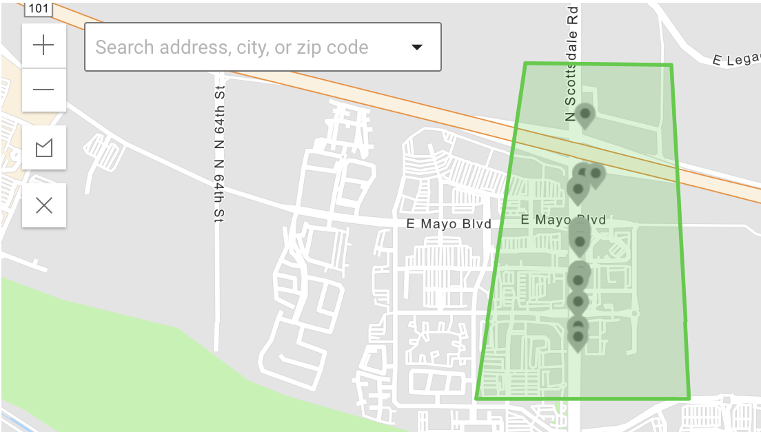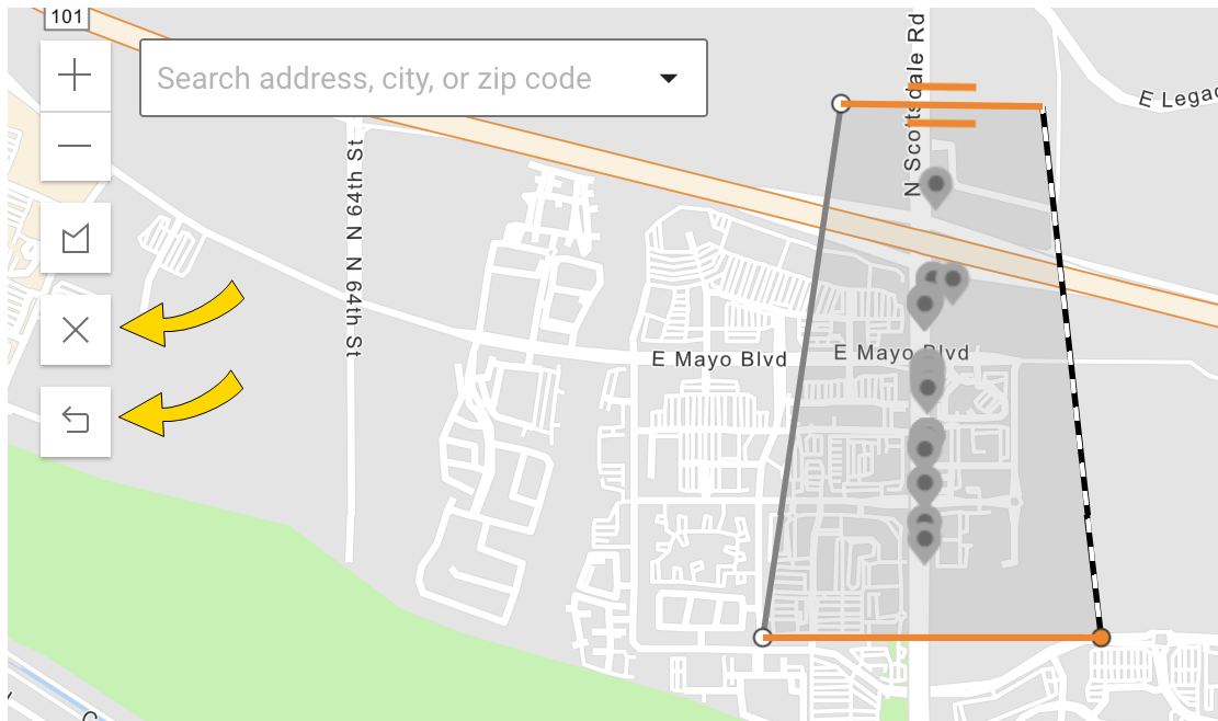 - Draw a shape (up to 20 non-intersecting points) on the map by clicking around the perimeter. Close the shape by either clicking again on the first point again or pressing Enter to auto-complete, at which point the area turns green.