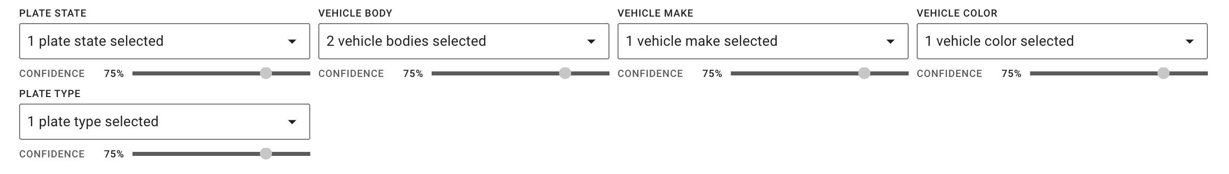 Confidence sliders under some vehicle attribute search fields let you adjust the volume of search results based on your investigative needs. The default value is 75%.