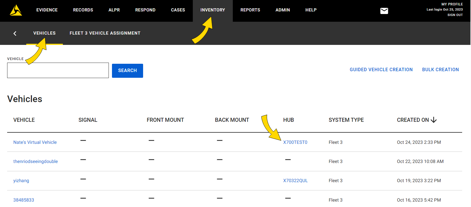 The hub details page in Axon Evidence identifies list status by list type, such as agency or NCIC. Go to Admin > Inventory > Vehicles:
