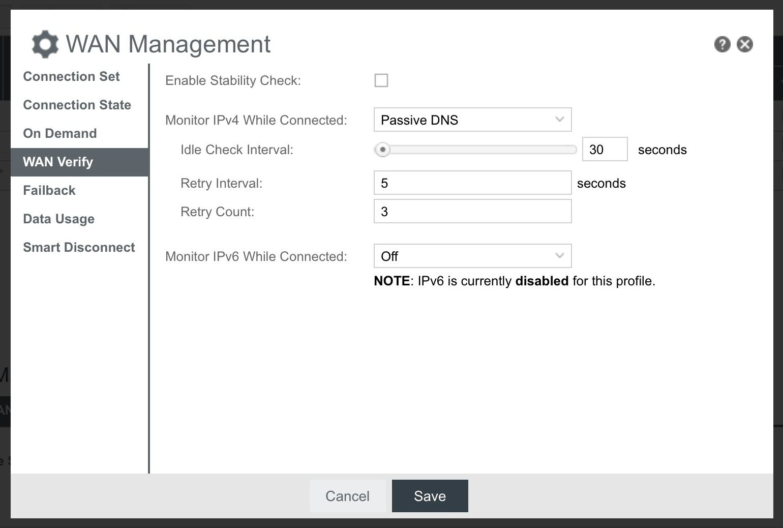 - Select WAN Verify and set the various fields as shown below and then Save: