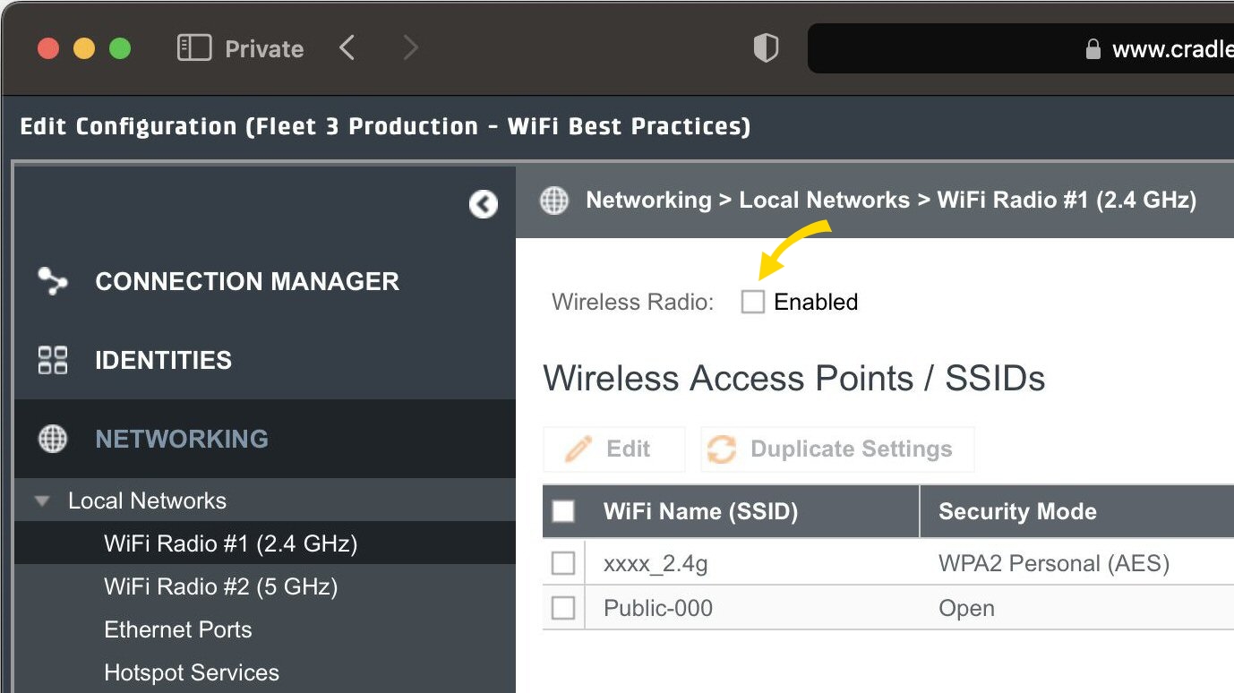 - In the left-nav, select Networking > Local Networks > Wi-Fi Radio #1 (2.4 GHz) and clear the check box at the top. Select Yes to ignore the inaccurate warning about "disable all wireless wireless access to the router“ and then Save.
