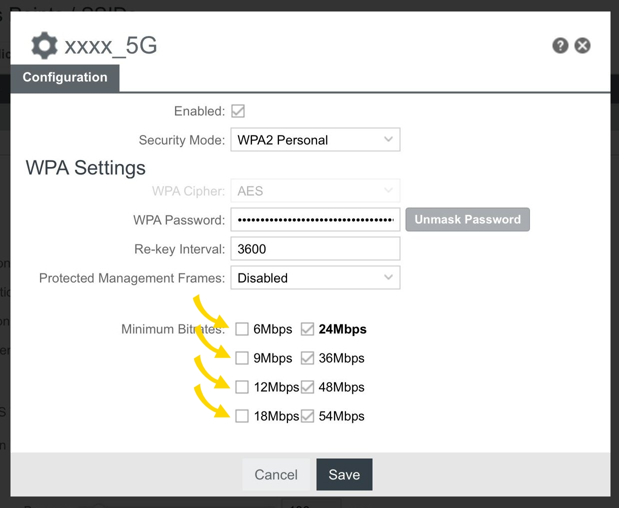 - Disable bitrates less than 24 Mbps and then Save: