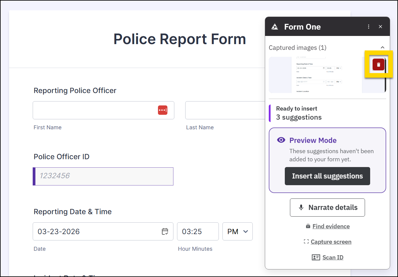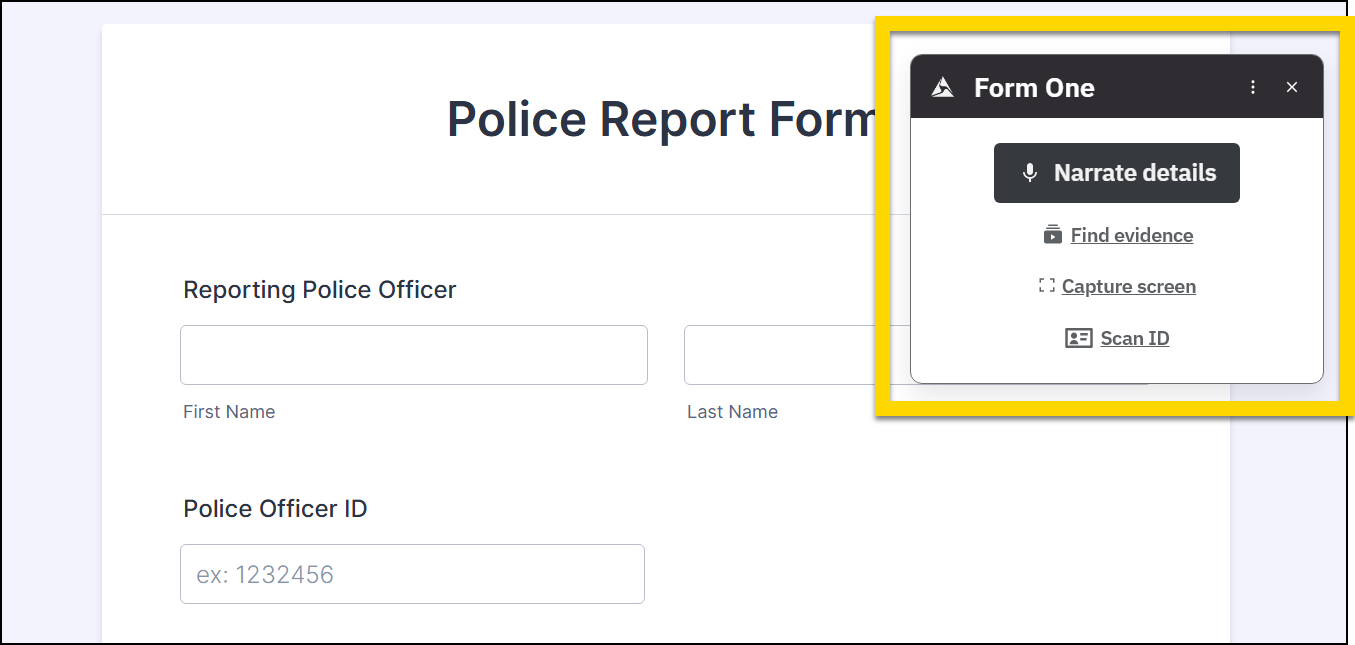 Form One is Axon’s AI-powered form assistant that helps users complete report forms faster. It is available to trial for all US-based AI Era Plan customers who use web-based forms and reporting systems. Contact your Axon representative if you are interested in trialing Form One.