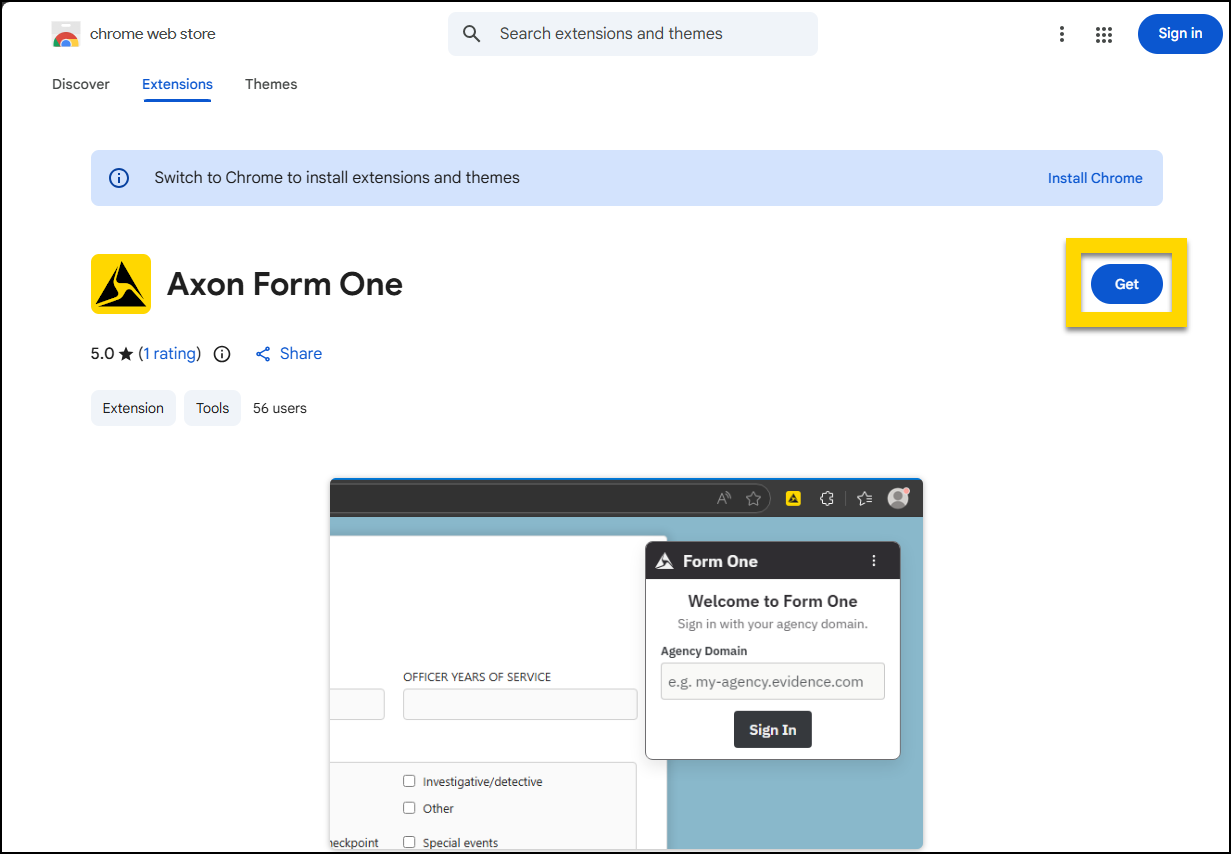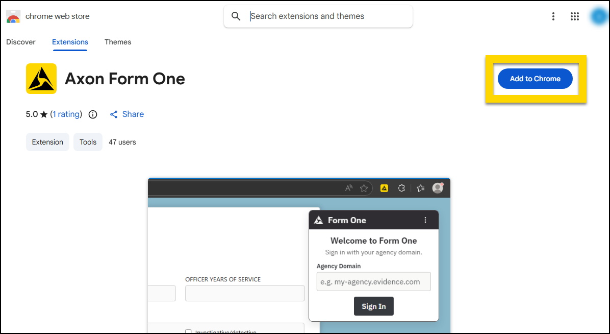 - Open a Google Chrome web browser and go to the Axon Form One extension in the Google Chrome Web Store.
