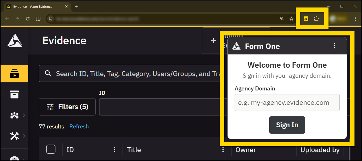 To use Form One, you must open the extension and log in to your Axon Evidence account: