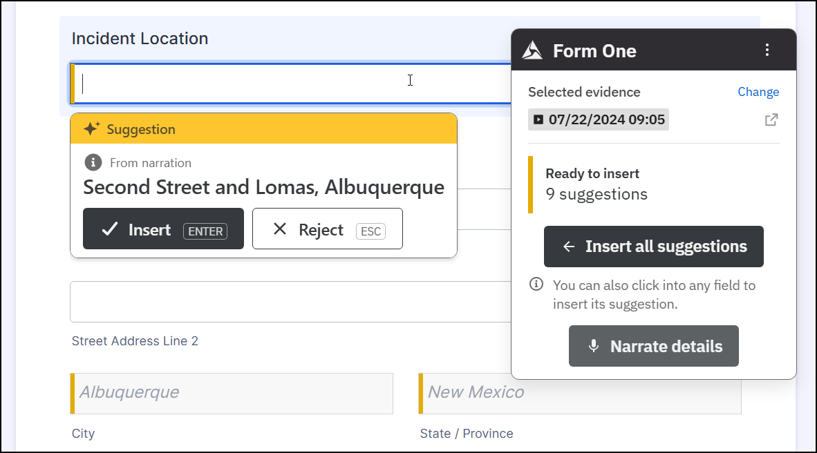 When you click into a field in the form that contains a suggestion, a window appears below that field and lists the suggestion for the field as well as where that suggestion came from (narration, the evidence item you selected, your Axon Evidence user profile, etc.). Select Insert (or press ENTER on your keyboard) to insert that suggestion, or select Reject (or press ESC on your keyboard) to delete that suggestion.