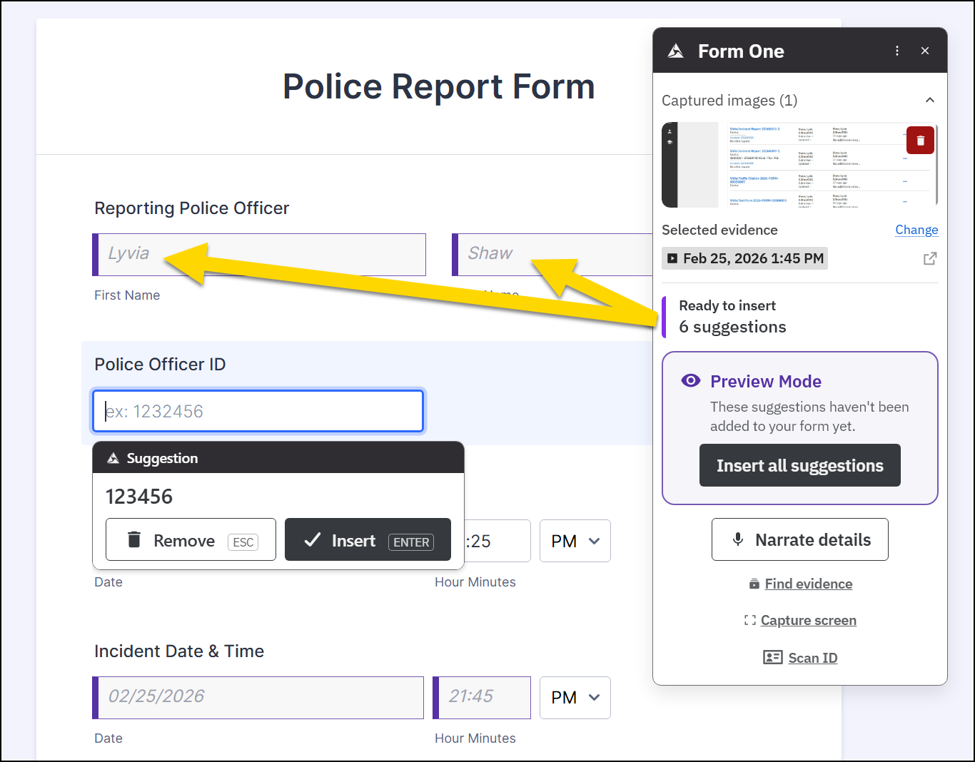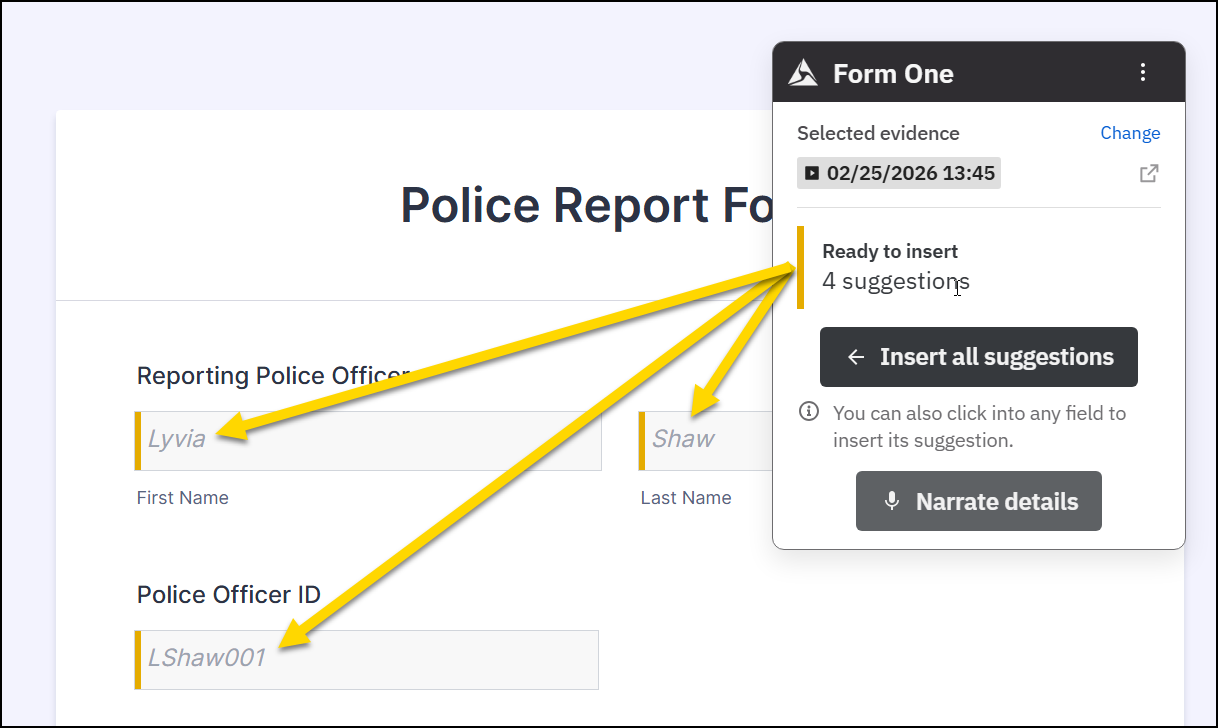 At any point, including after you have selected other evidence sources or inserted suggestions, you can provide additional details for more fields that don't have suggestions, select Narrate details. You can then speak out loud while Form One records to provide additional information. When you are finished, select Stop narration.