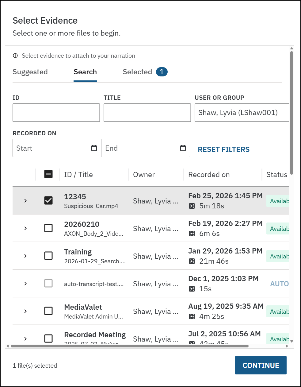 - Available items are evidence files that have been uploaded to Axon Evidence and had a transcript generated.