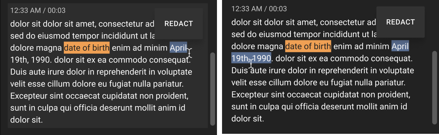 - Select Redact. Shows a section of transcript text with the word