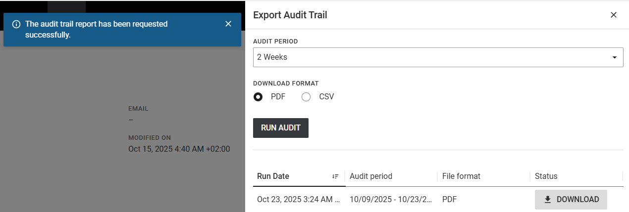 This includes added fields of evidence modifications, source device information and report generation. Audit Trails can now be narrowed down by selecting the time or audit period in addition to the date-picker. The 10 last ran audits are now also directly visible in the sidebar and can be downloaded using the DOWNLOAD button, so users can now return to these pages and re-download the exact file without regenerating it, which is especially helpful for scheduled reviews or audits.