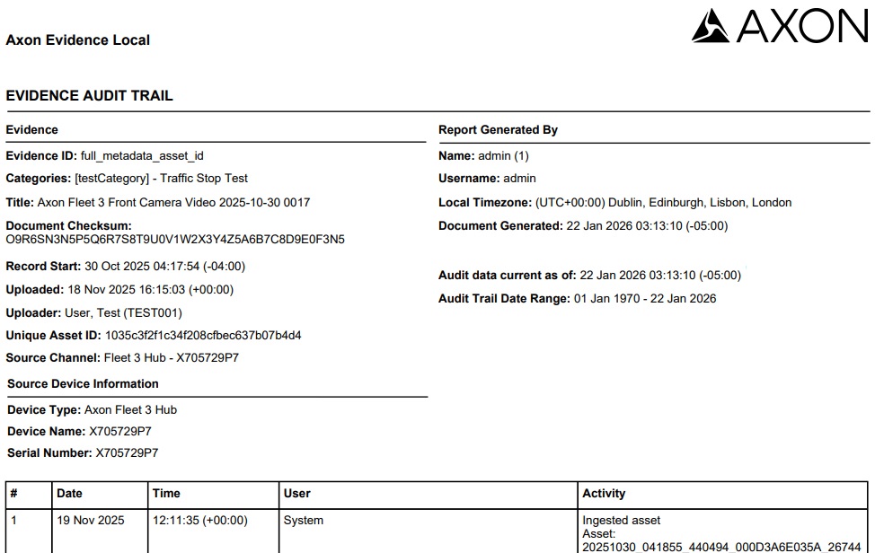 With this release, Axon Evidence Local also introduces an upgraded audit trail functionality to provide a more data-rich header for Evidence details, Source Device and Report Generation info.