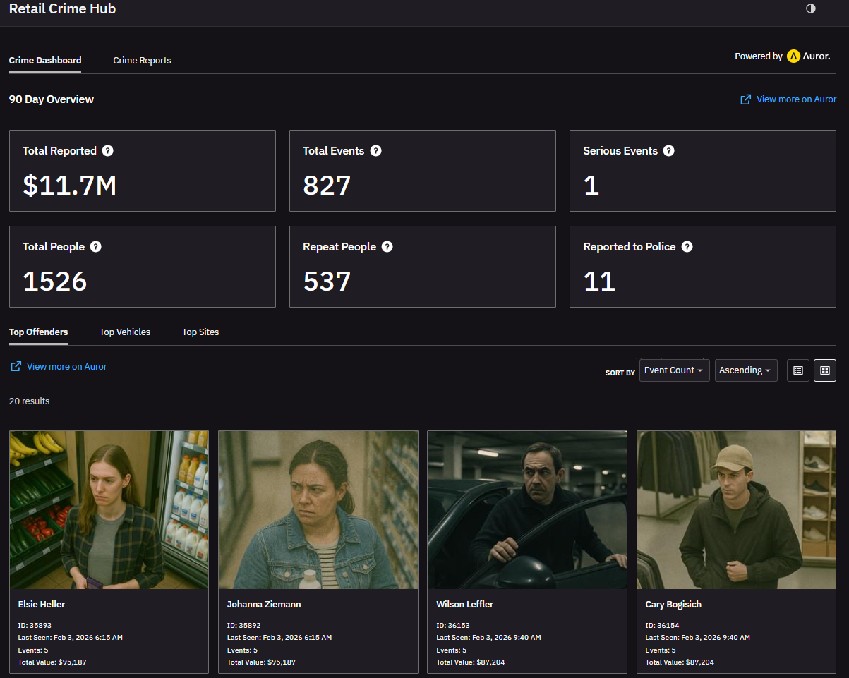 - Crime Dashboard: View recent retail crime activity in your jurisdiction based on data provided by participating retailers through Auror. Filter and review by offender, vehicle, and site, then open records in Auror for deeper investigation.